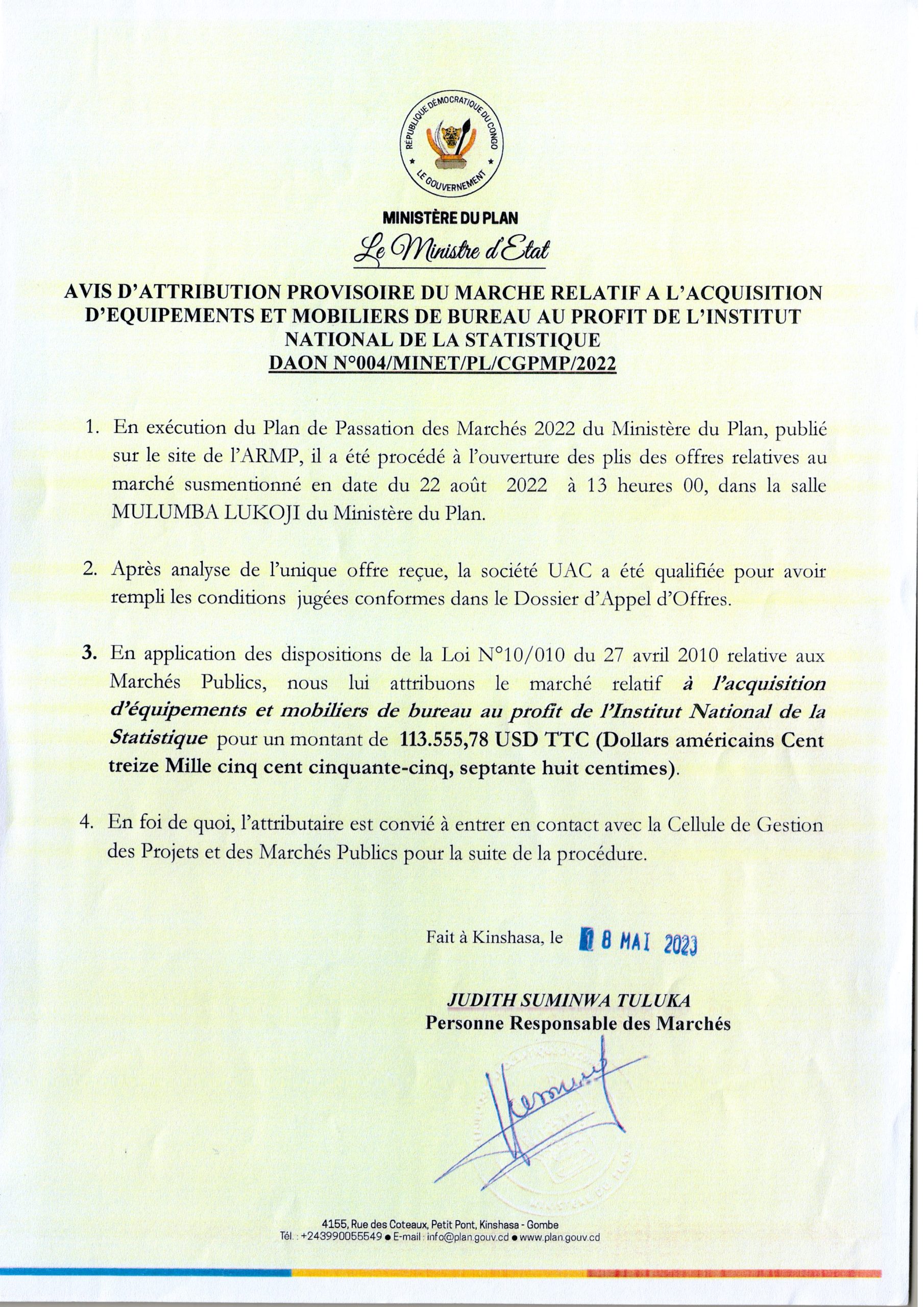 Attribution provisoire accordée à la société UAC relative à l’acquisition d’équipements et mobiliers de bureau au profit de l’Institut National de la statistique.
