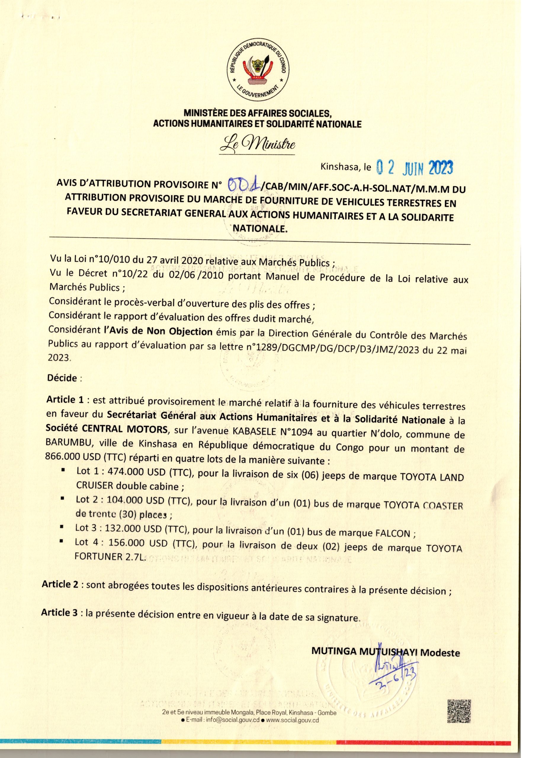 ATTRIBUTION PROVISOIRE ACCORDÉE À LA SOCIÉTÉ CENTRAL MOTORS RELATIVE À LA FOURNITURE DES VÉHICULES TERRESTRES EN FAVEUR DU SECRÉTARIAT GÉNÉRAL AUX ACTIONS HUMANITAIRES ET À LA SOLIDARITÉ NATIONALE.