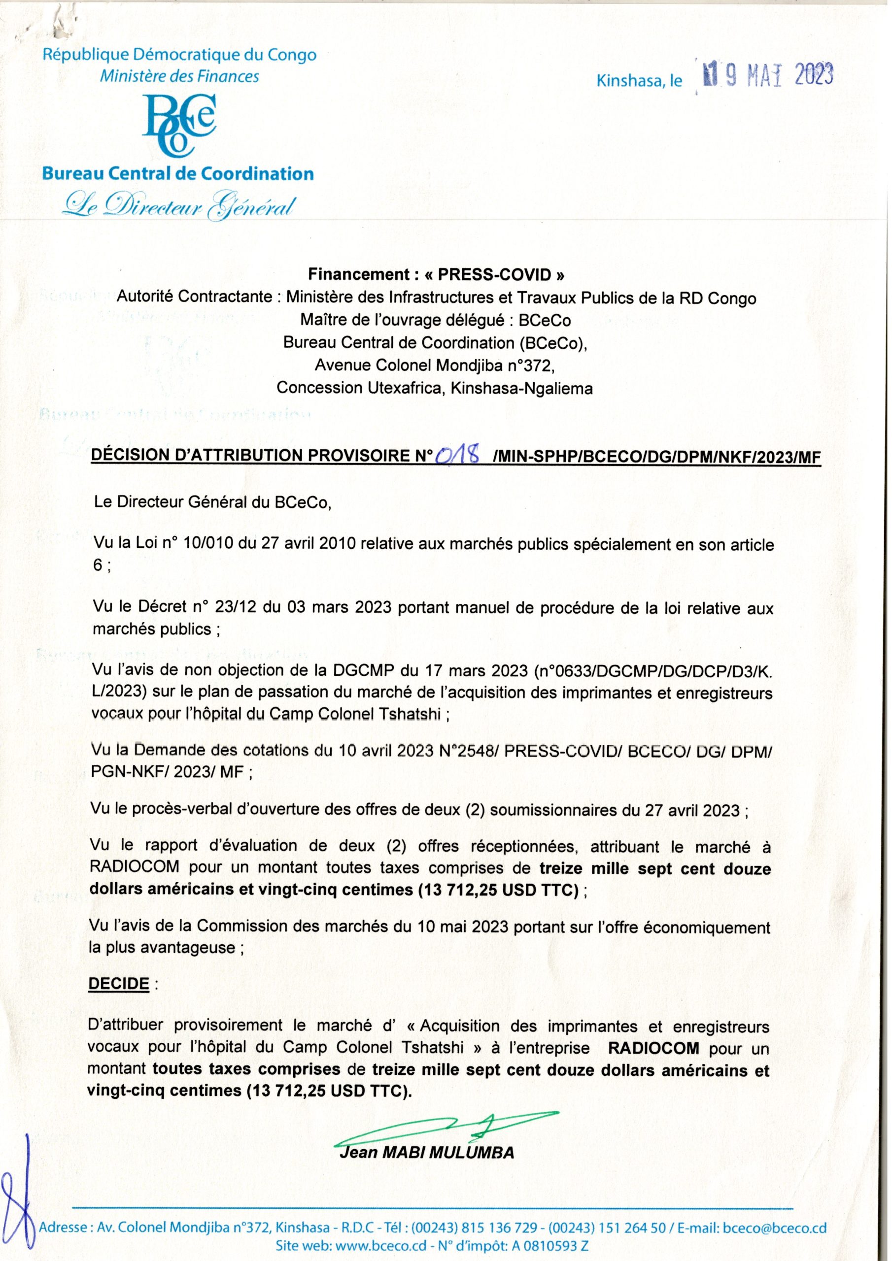 ATTRIBUTION PROVISOIRE DE LA BCECO ACCORDÉE À L’ENTREPRISE RADIOCOM RELATIVE À L’ACQUISITION DES IMPRIMANTES ET ENREGISTREURS VOCAUX POUR L’HÔPITAL DU CAMP COLONEL TSHATSHI .