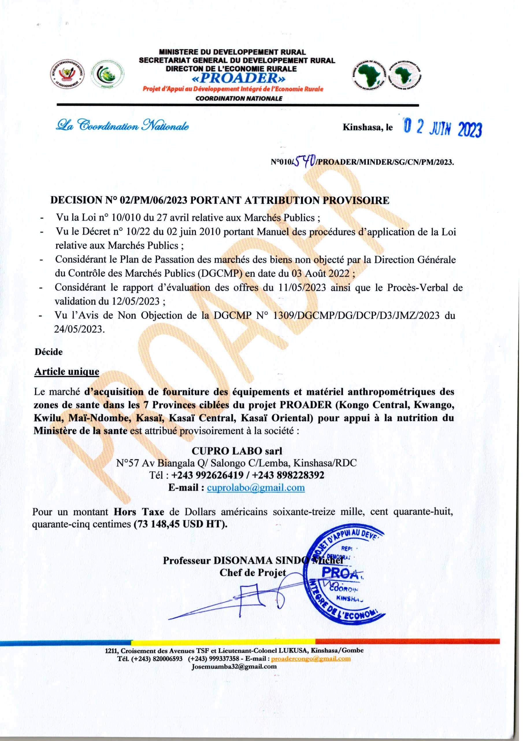 Attribution provisoire accordée à la Société CUPRO LABO Sarl relative au marché d’acquisition de fourniture des équipements et matériel anthropométrique des zones de sante dans les 7 provinces ciblée du projet PROADER (Kongo Central, Kwango…