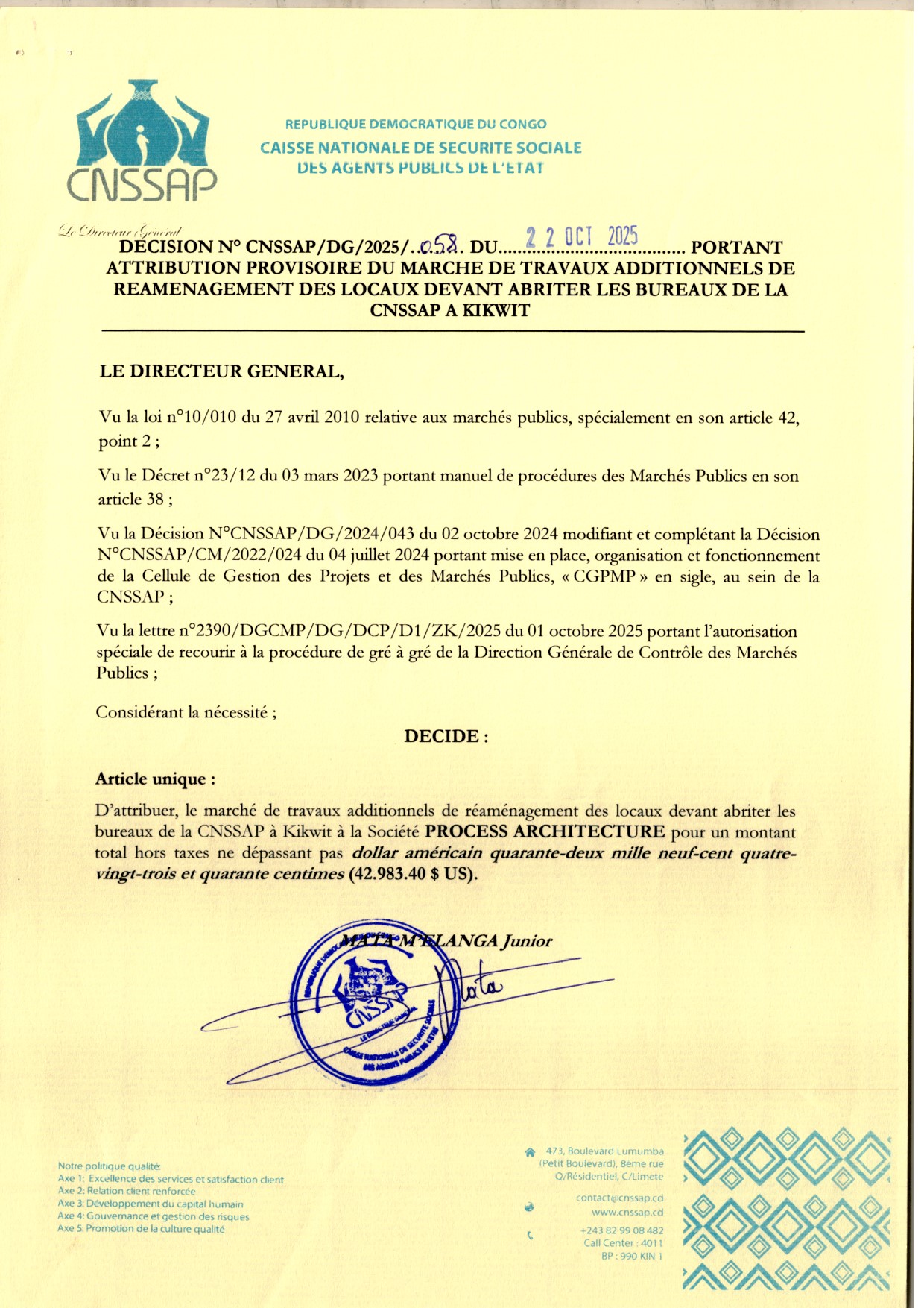 Attribution Provisoire du marché de travaux additionnels de réaménagement des locaux devant abriter les bureaux de la CNSSAP à Kikwit à la société PROCESS ARCHITECTURE