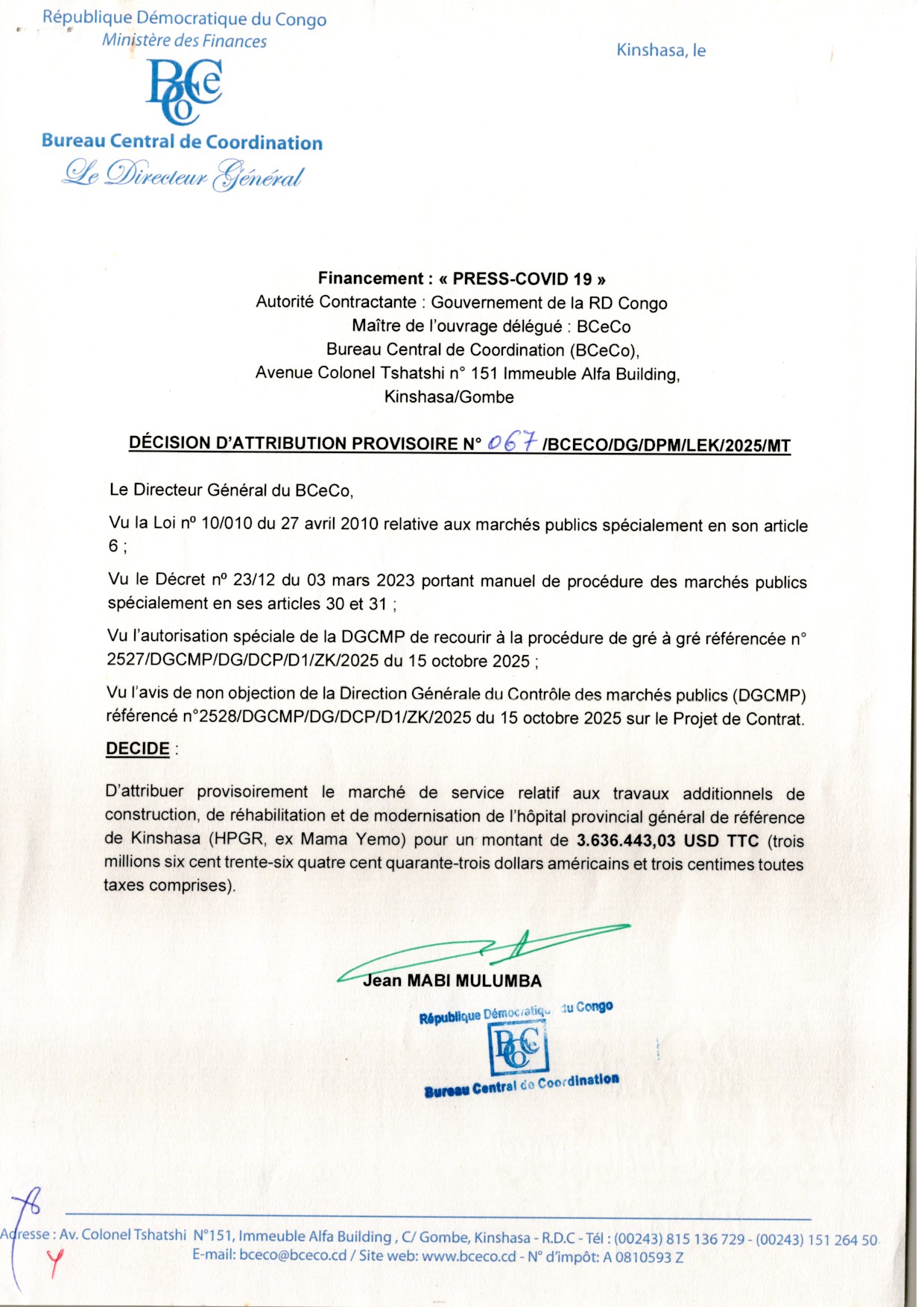 Attribution provisoire accordée à la BCECO relative aux travaux additionnels de construction, de réhabilitation et de modernisation de l’hôpital provincial général de référence de Kinshasa (HPGR, ex Mama Yemo).