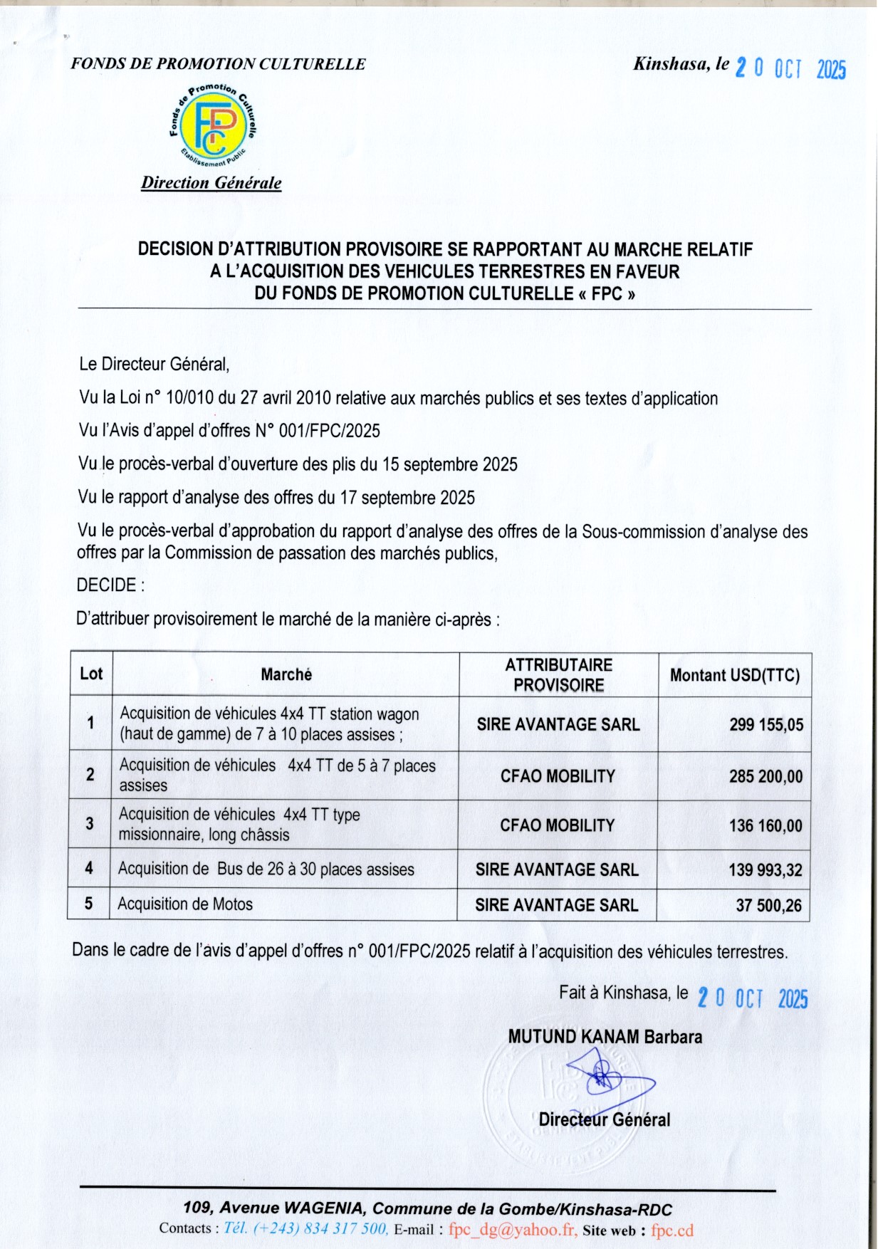 Attribution provisoire accordée à SIRE AVANTAGE lot 1, 4 et 5 et CFAO MOBILITY lot 2 et 3 marché relatif à l’acquisition des véhicules terrestres en faveur du Fonds de Promotion Culturelle “FPC”