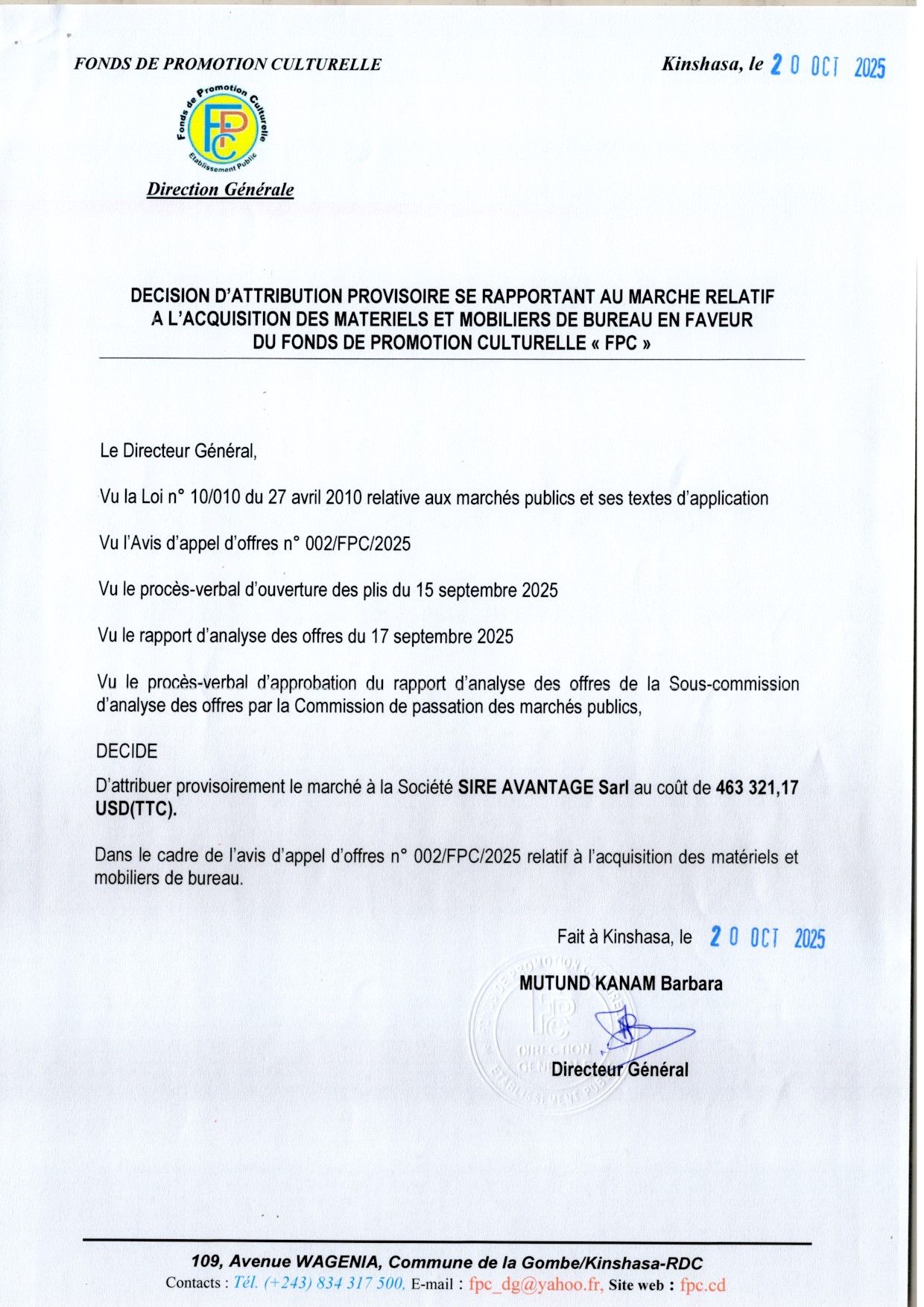 Attribution provisoire accordée à la société SIRE AVANTAGE relative à l’acquisition des matériels et mobiliers de bureau en faveur du Fonds de Promotion Culturelle “FPC”
