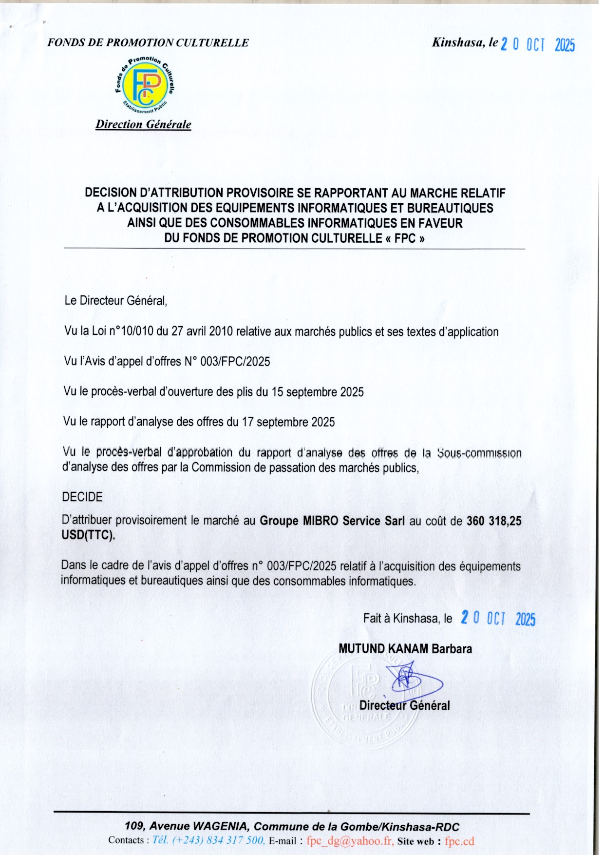 Attribution provisoire accordée au Groupe MIBRO Service relative à l’acquisition des équipements Informatiques et bureautiques ainsi que des consommables Informatiques en faveur du Fonds de Promotion Culturelle “FPC”