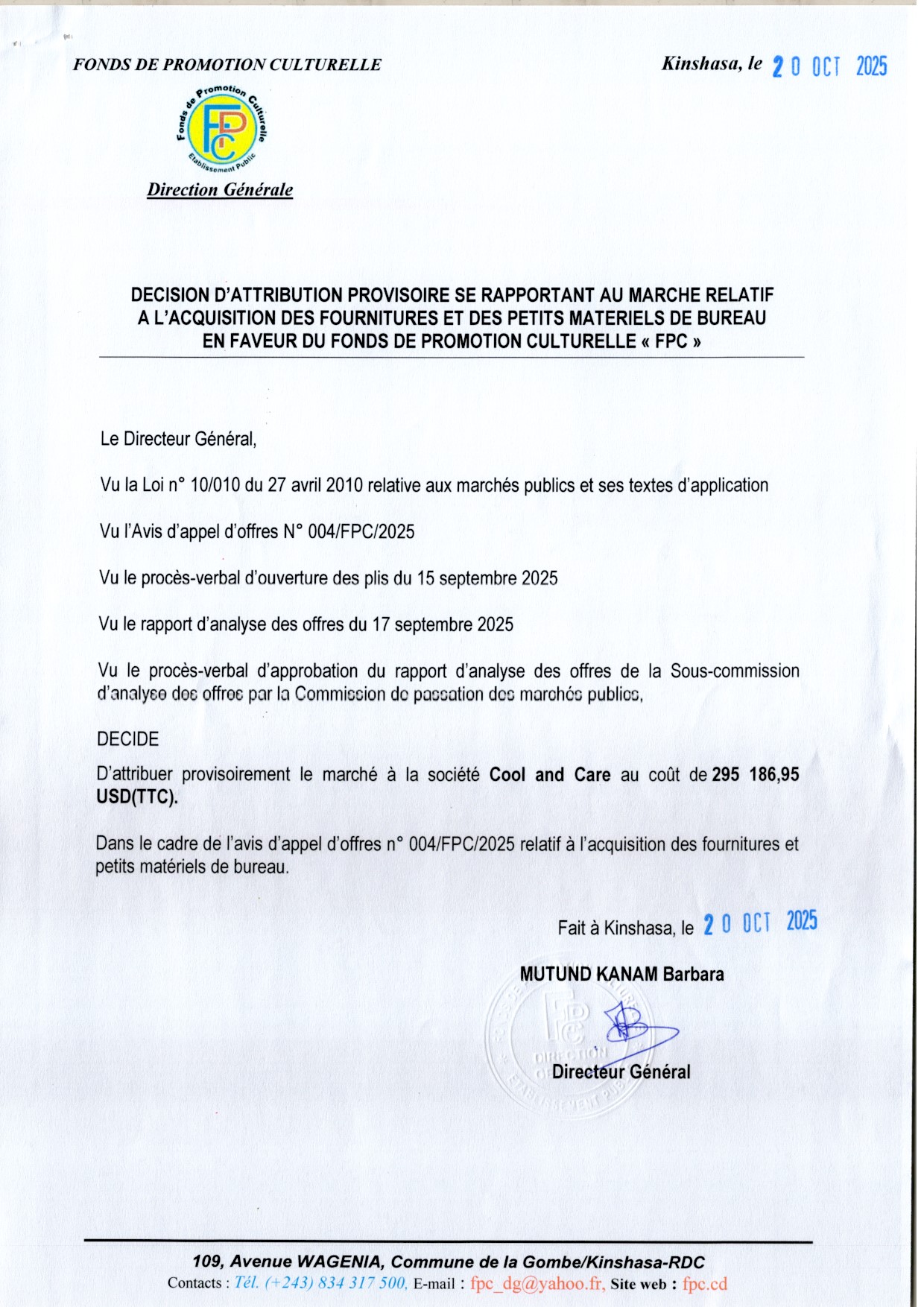 Attribution provisoire accordée à la société Cool and Care à l’acquisition des Fournitures et des petits matériels de bureau en faveur du Fonds de Promotion Culturelle “FPC”