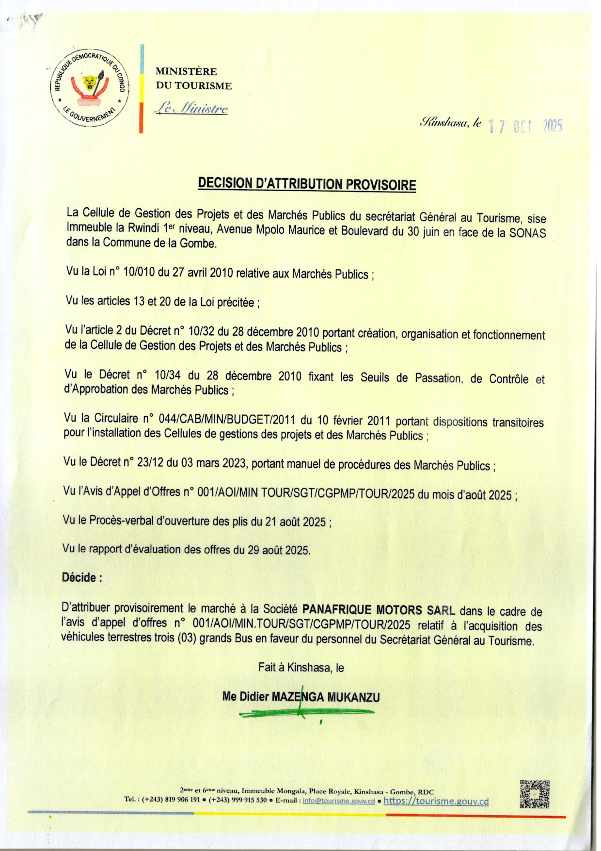 Attribution provisoire accordée à la société PANAFRIQUE MOTORS relative à l’acquisition des véhicules terrestres (03) grands Bus en faveur du personnel du Secrétariat Général au Tourisme.