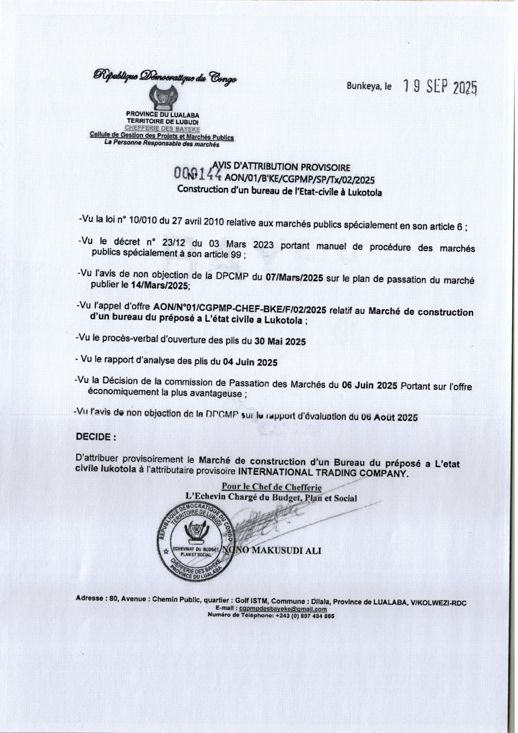 Attribution provisoire accordée à INTERNATIONAL TRADING COMPANY relative à la construction d’un bureau de l’Etat-Civil à Lukotola