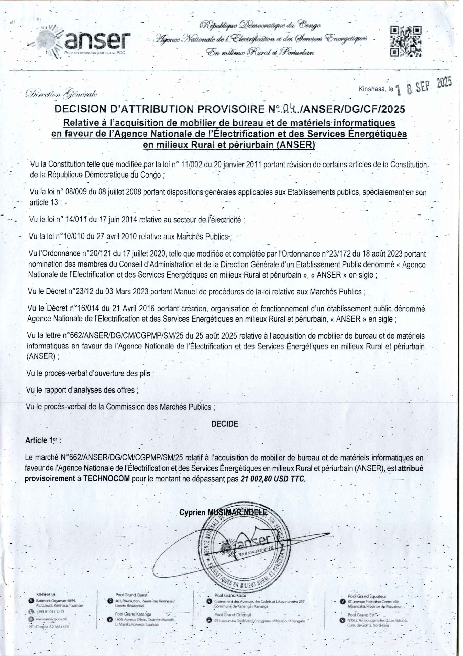 Attribution provisoire accordée à TECHNOCOM relative à l’acquisition de mobilier de bureau et de matériels informatiques en faveur de l’Agence Nationale de l’Electrification et des Services Energétiques en milieux Rural et périurbain (ANSER).