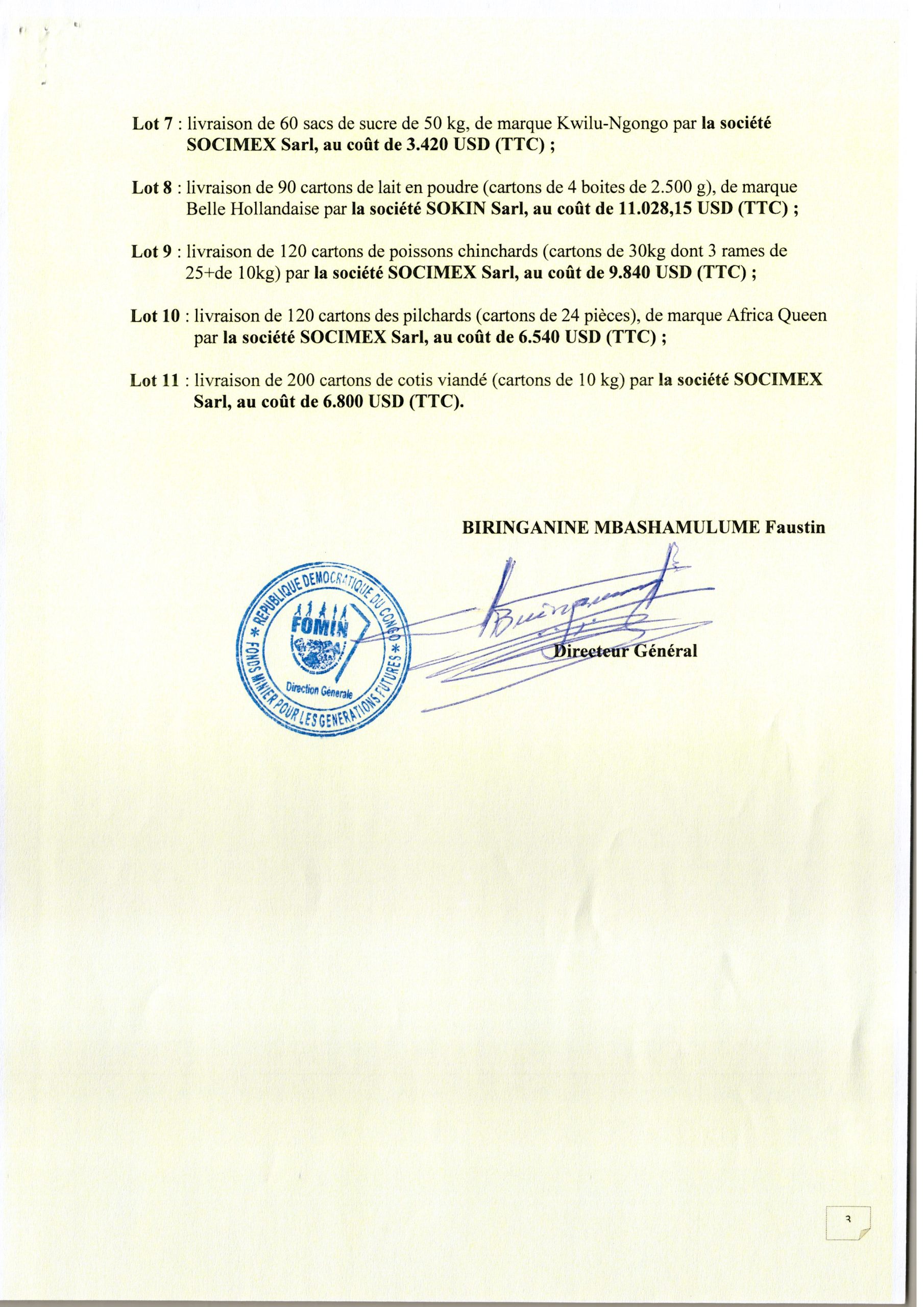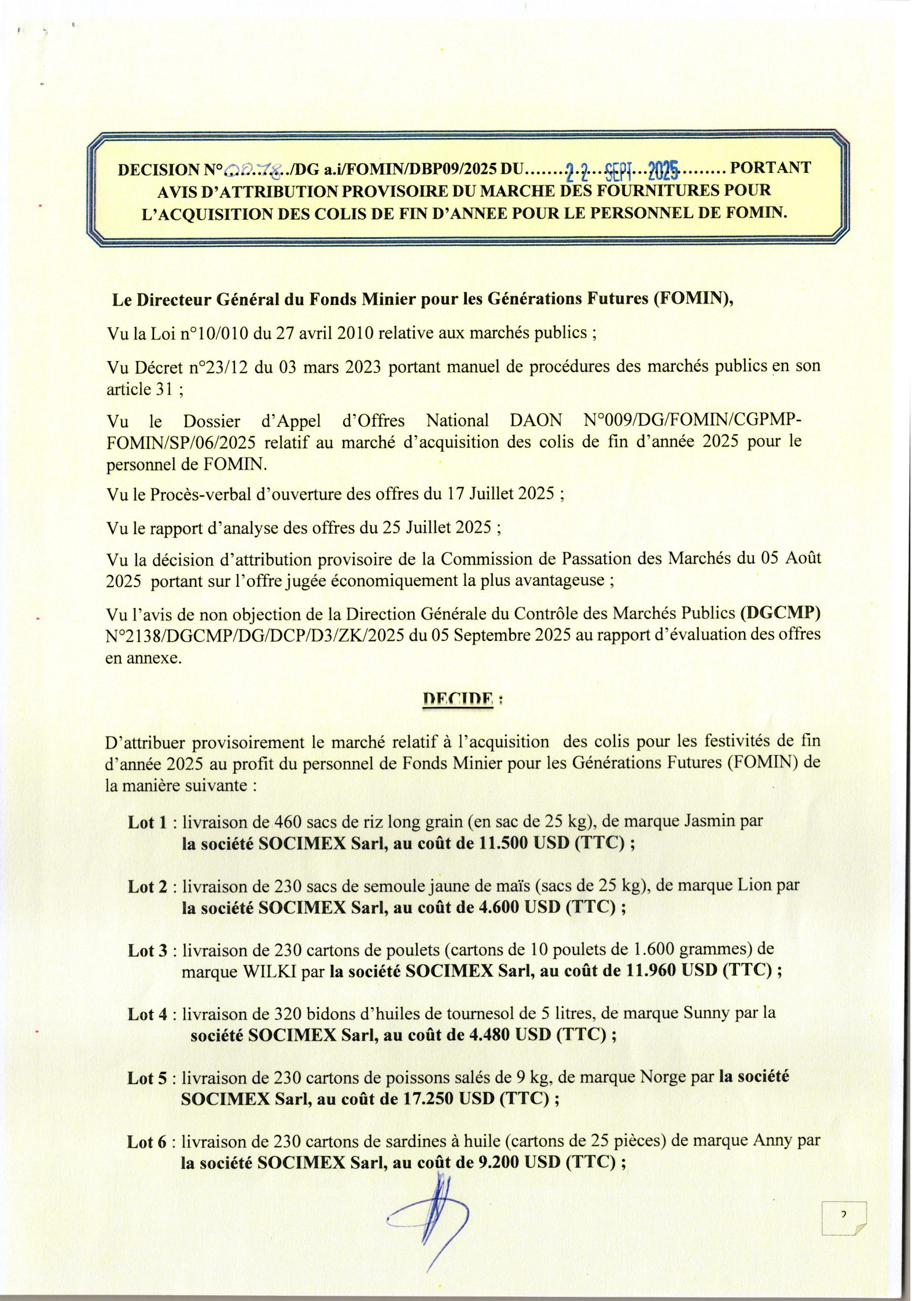 Attribution provisoire accordée à la société SOCIMEX Sarl relatif au marché de fourniture et acquisition des colis de fin d’année pour le personnel de FOMIN (lot 1,2,3…et 11).