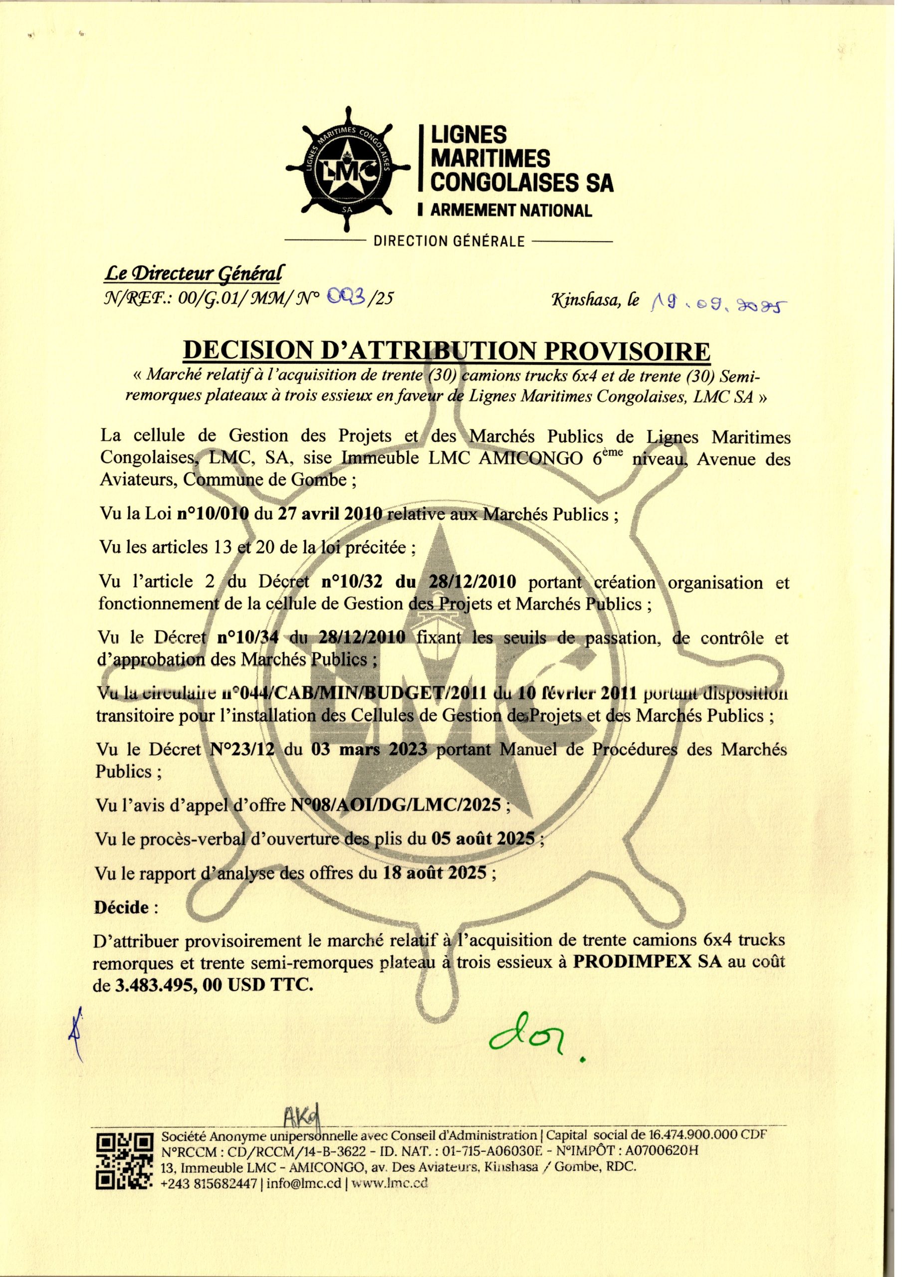 Attribution provisoire accordée à la société “PRODIMPEX SA” le marché relatif à l’acquisition de trente 30 camions trucks 6×4 et de trente 30 semi-remorques plateaux à trois essieux en faveur de LMC.