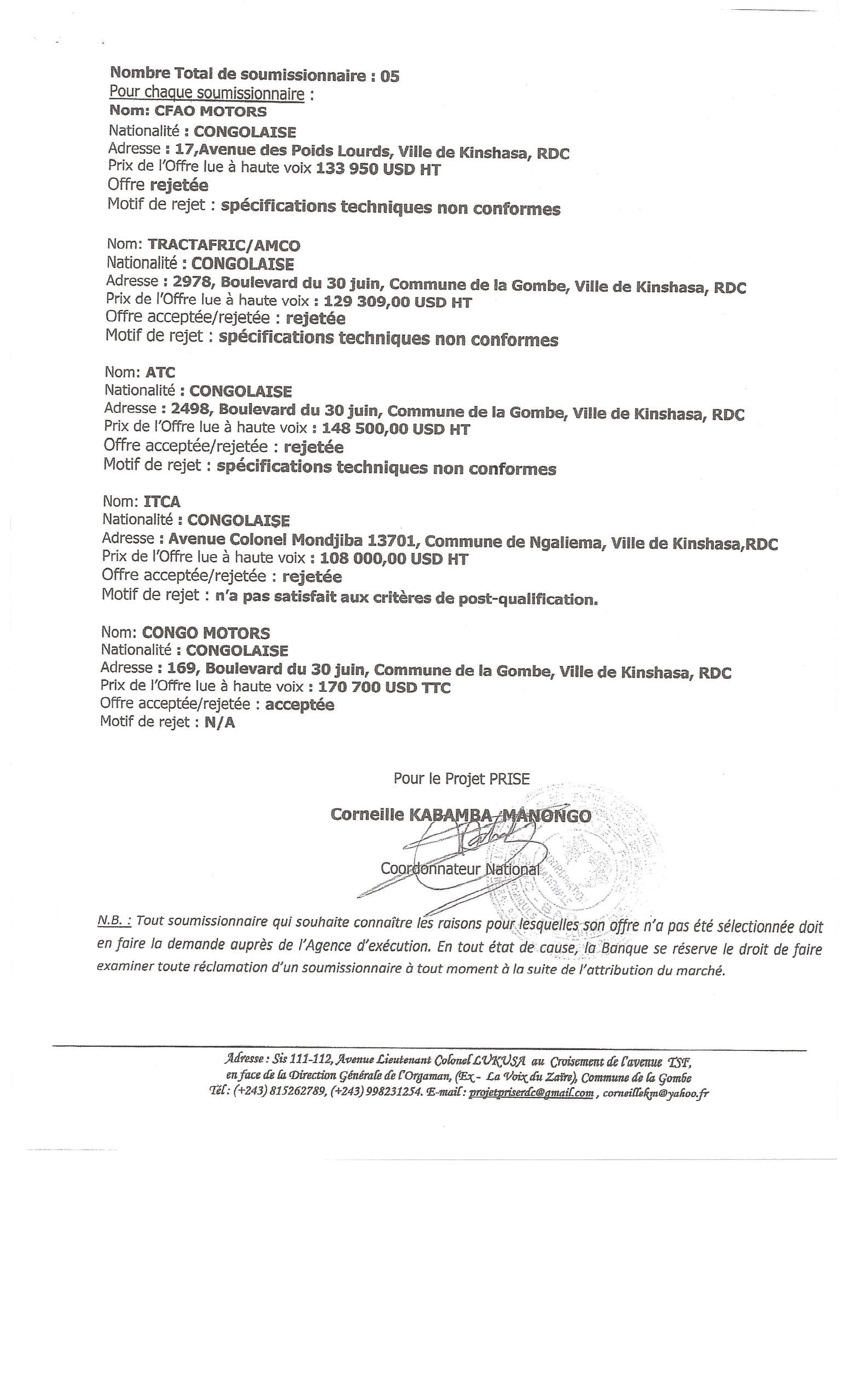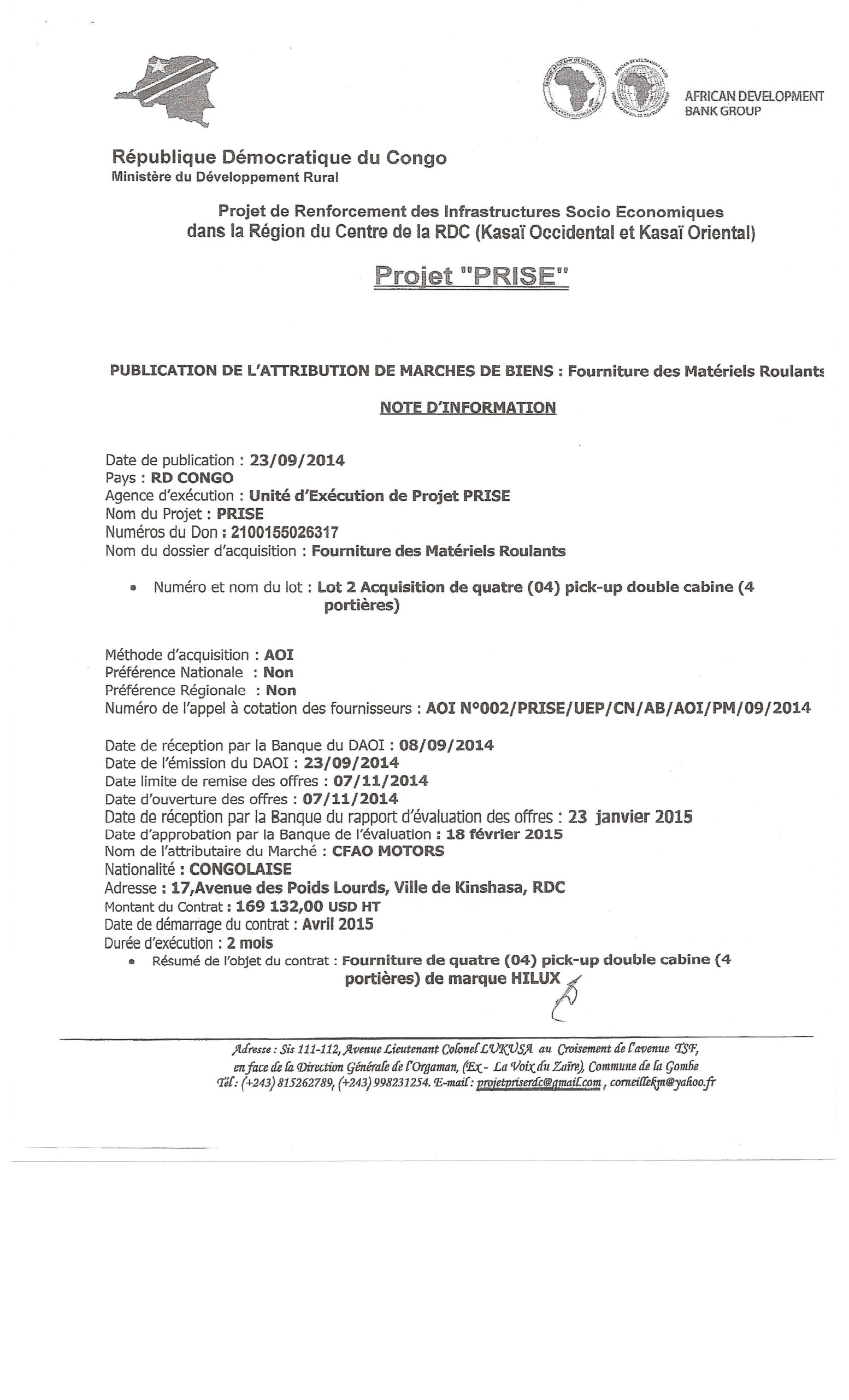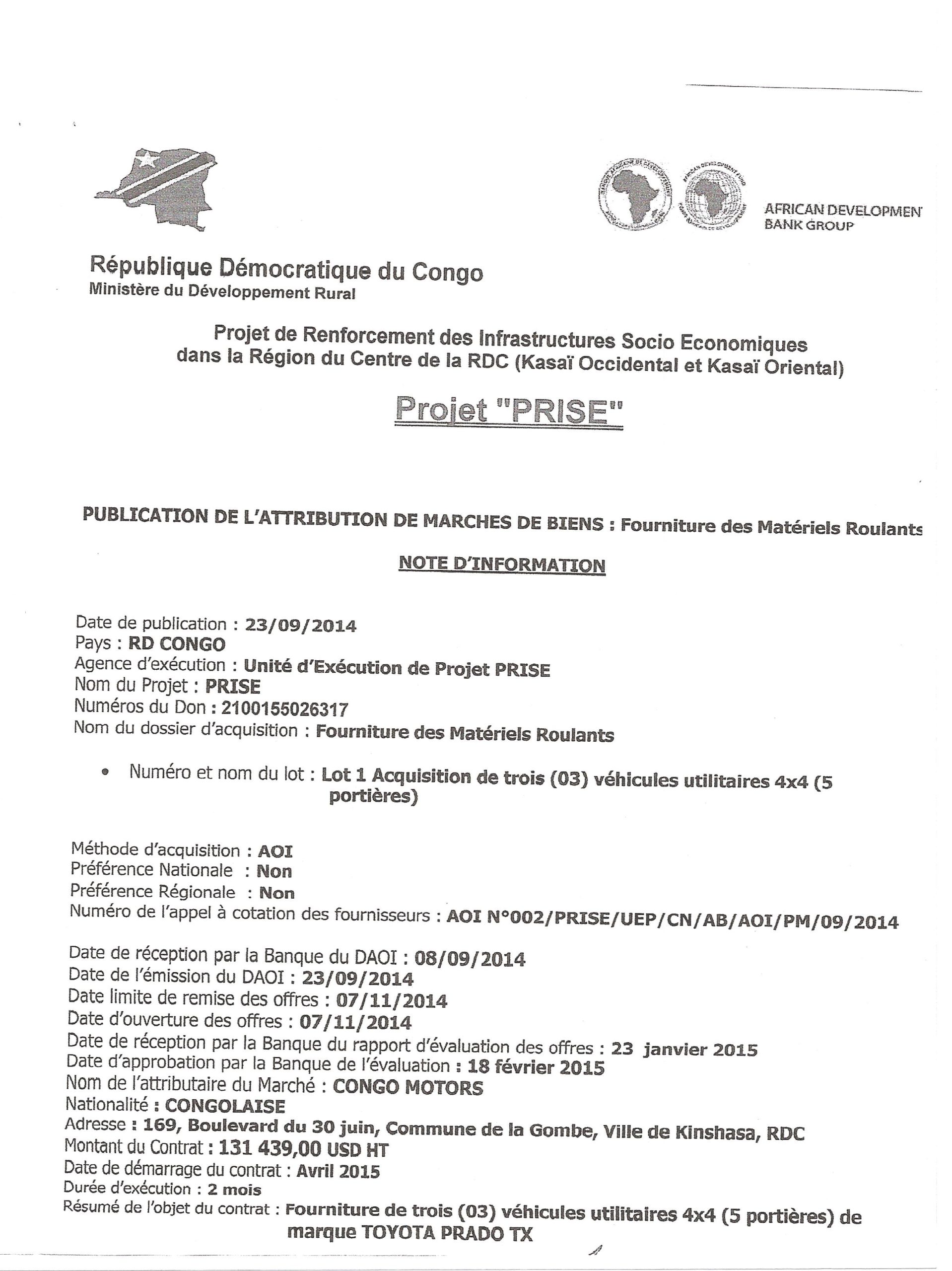 ATTRIBUTION DE MARCHÉ DE FOURNITURE DES MATÉRIELS ROULANTS POUR L’ACQUISITION DE TROIS (3) VÉHICULES UTILITAIRES 4X4 5 PORTIÈRES LOT 1.