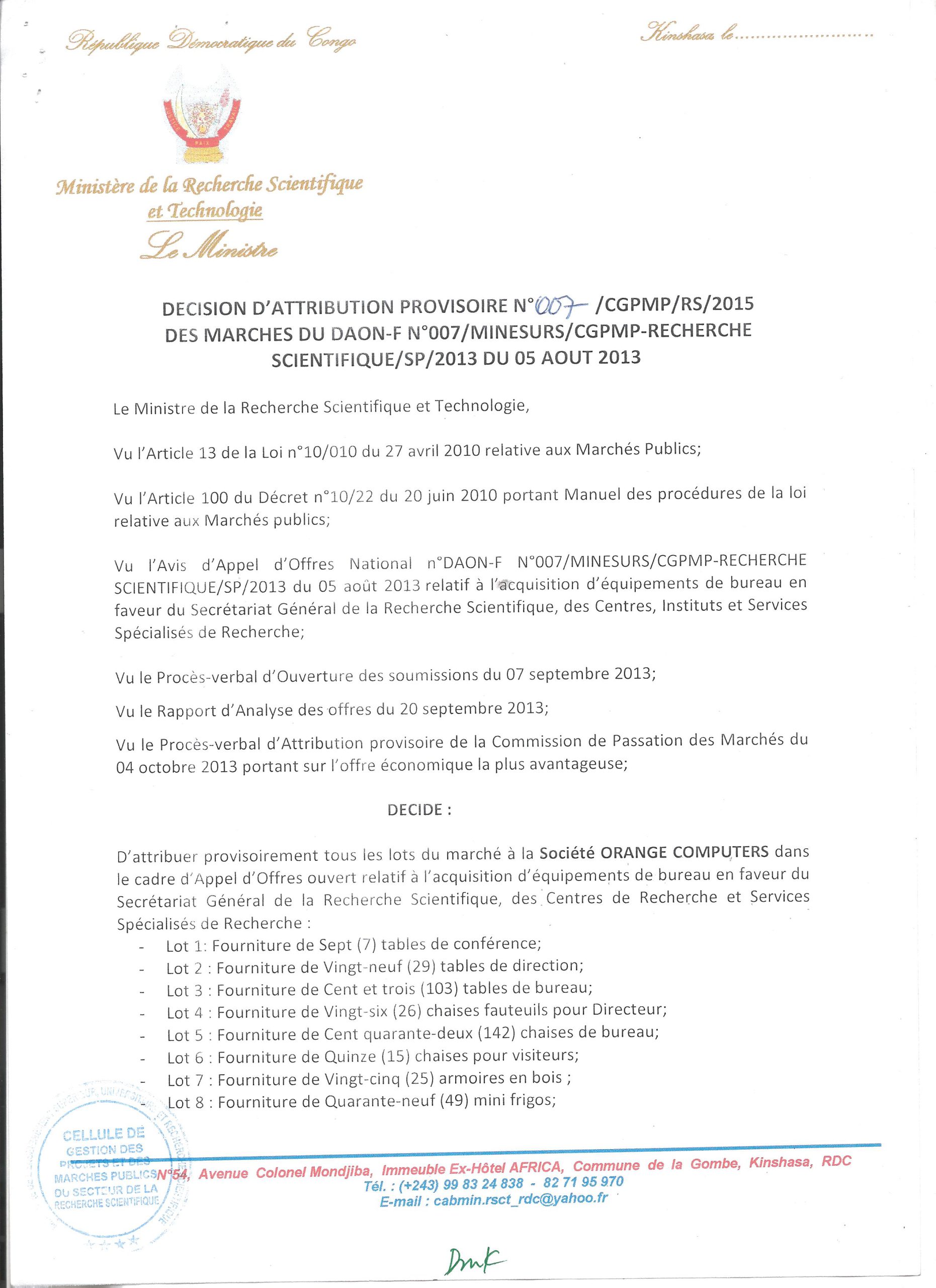 ATTRIBUTION PROVISOIRE À LA SOCIÉTÉ ORANGE COMPUTERS DU MARCHÉ RELATIF À L’ACQUISITION D’ÉQUIPEMENTS DE BUREAU EN FAVEUR DU SECRÉTARIAT GÉNÉRAL DE LA RECHERCHE SCIENTIFIQUE, …