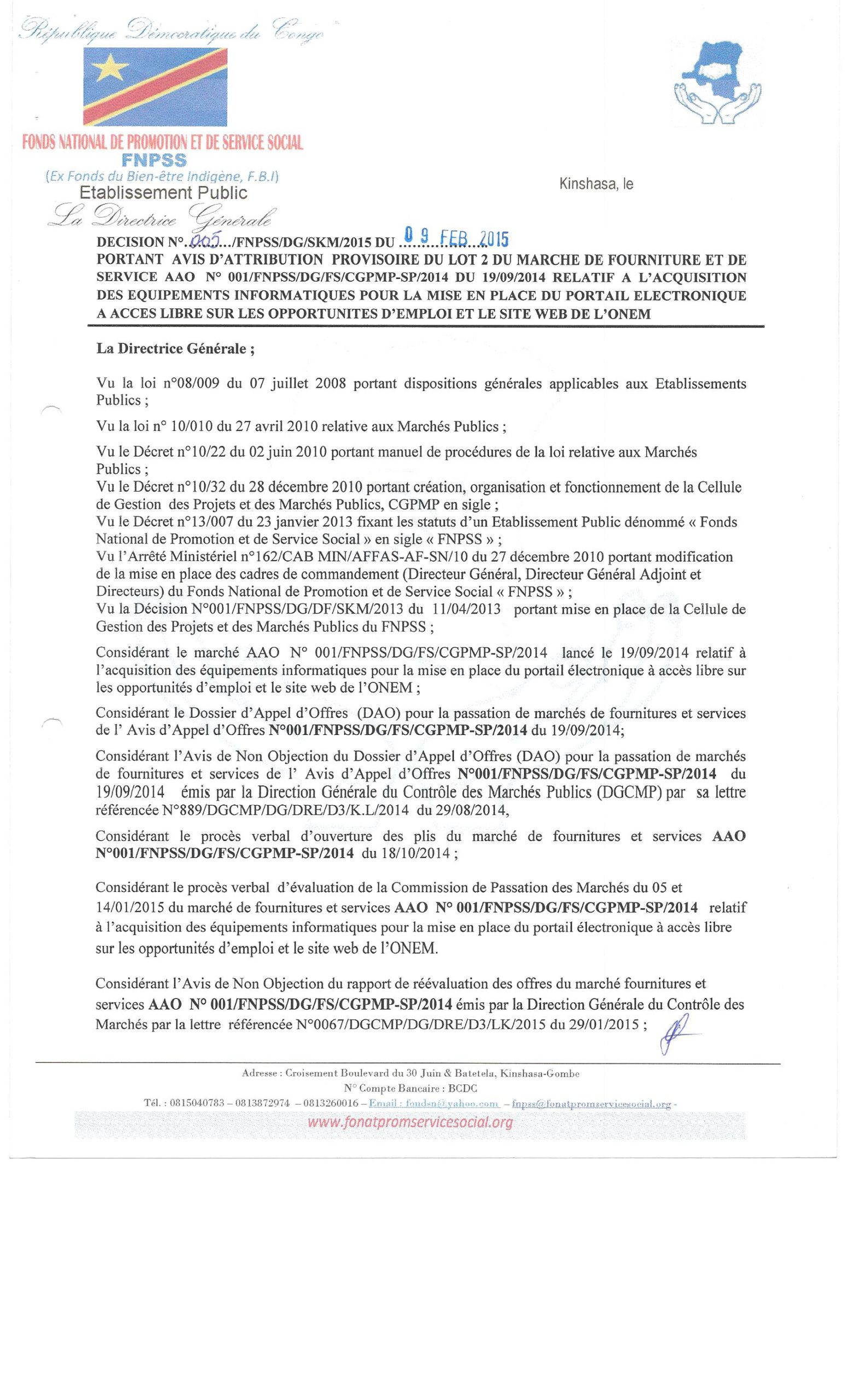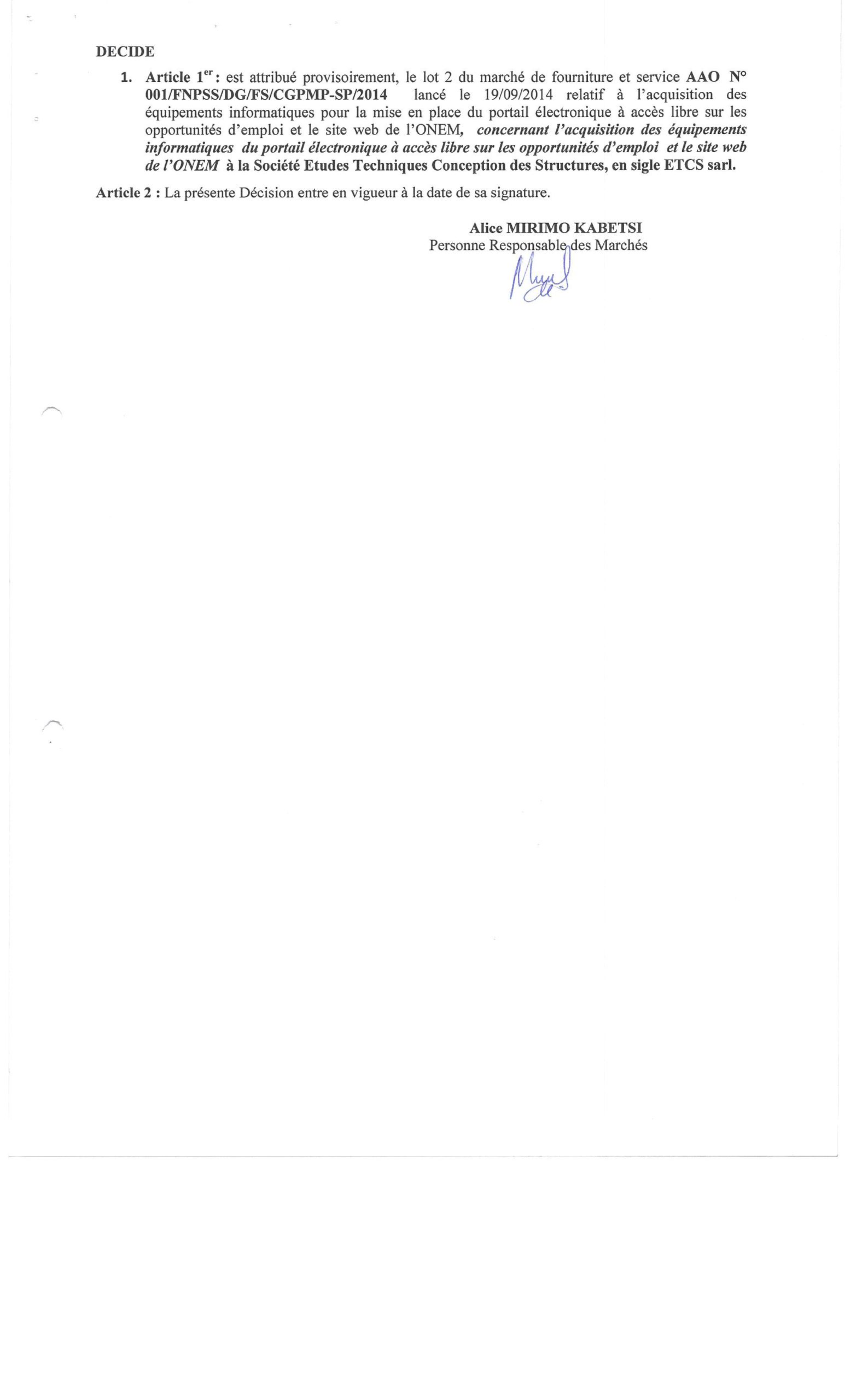 ATTRIBUTION PROVISOIRE À LA SOCIÉTÉ ETCS DU MARCHÉ RELATIF À L’ACQUISITION DES ÉQUIPEMENTS INFORMATIQUES POUR LA MISE EN PLACE D’UN PORTAIL ÉLECTRONIQUE …LOT 2