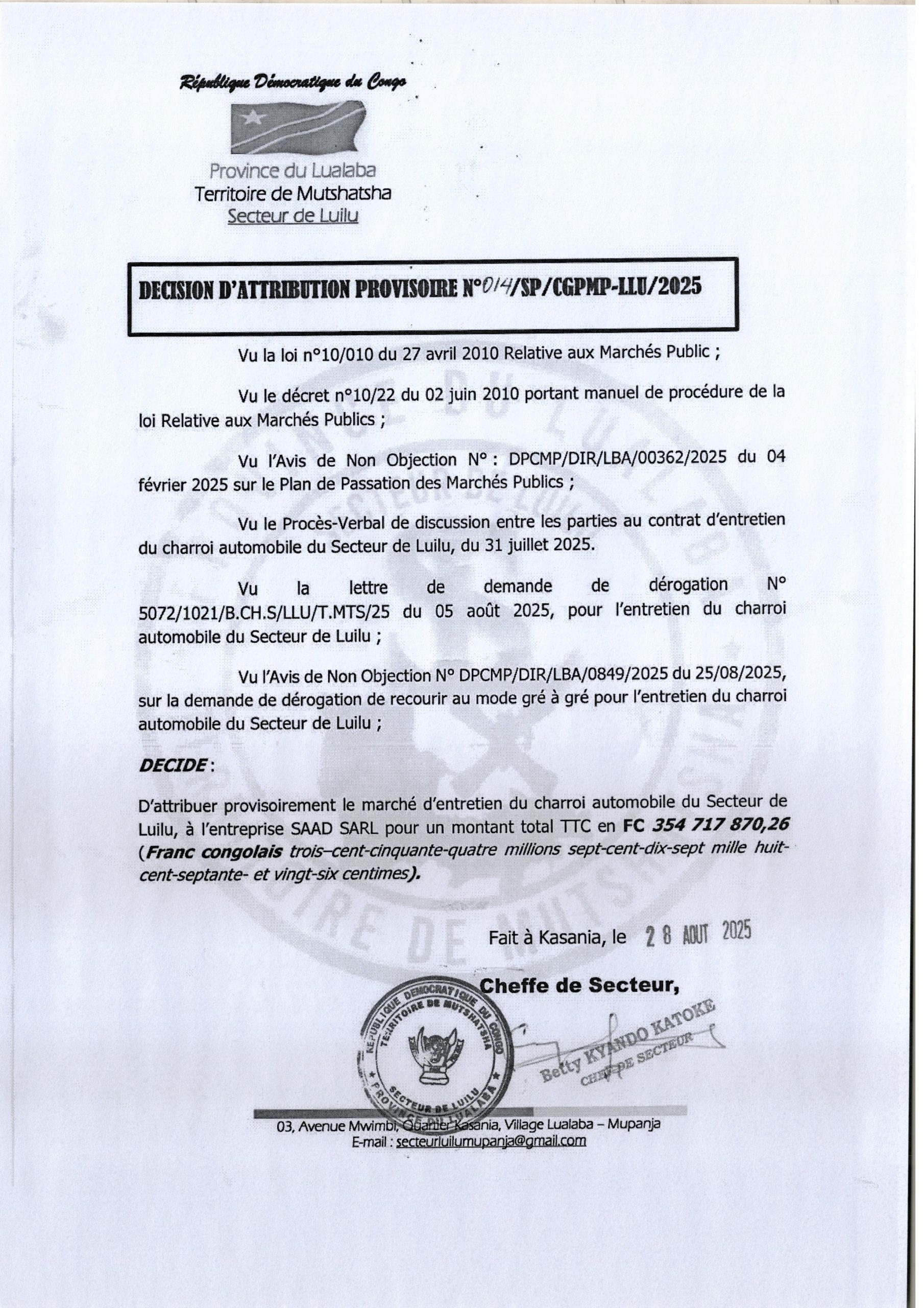 Attribution Provisoire accordée à l’Entreprise SAAD relative à l’Entretien du charroi automobile du Secteur de Luilu