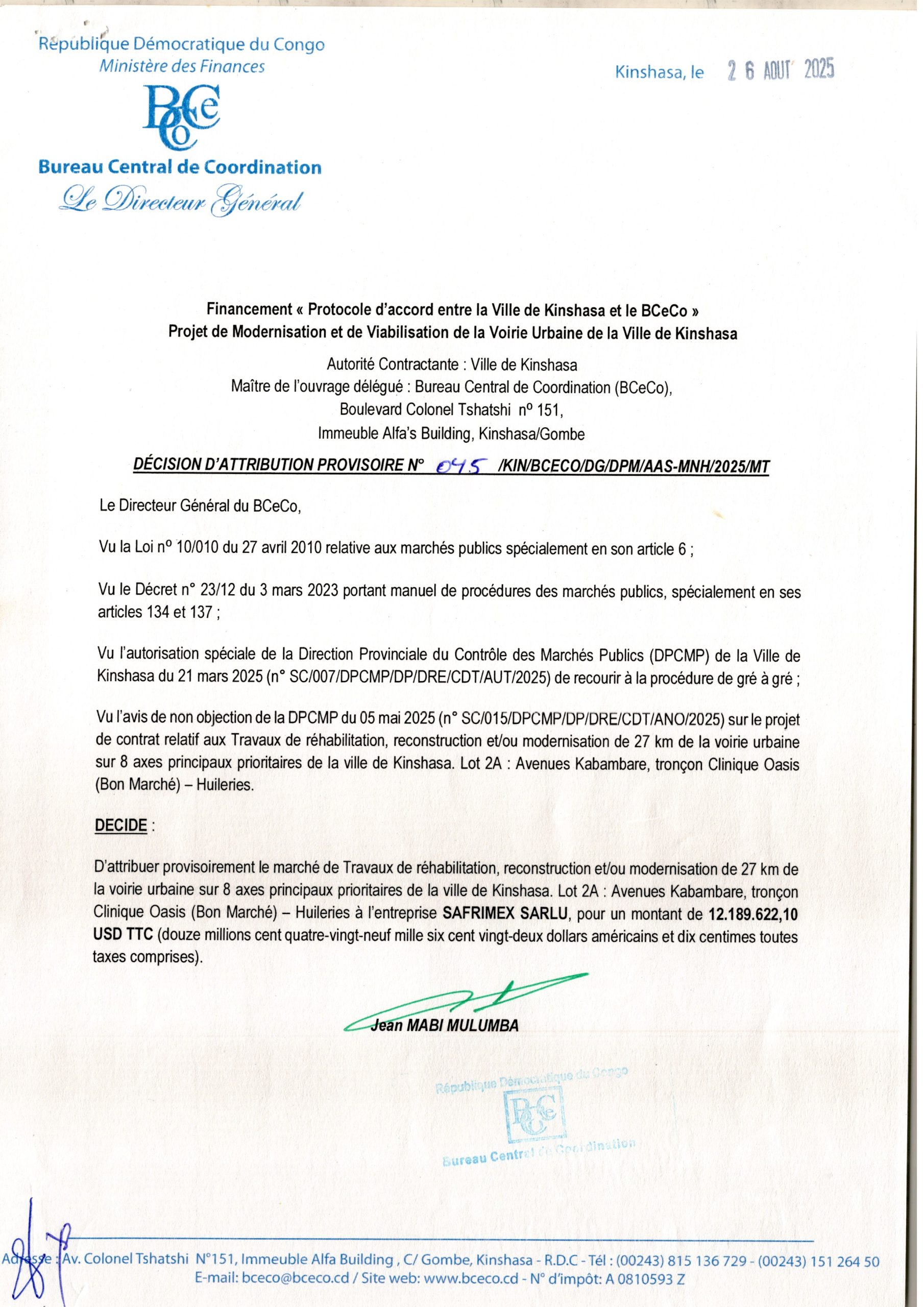 Attribution provisoire accordée à l’entreprise SAFRIMEX SARLU relative aux travaux de réhabilitation, reconstruction et/ou modernisation de 27 km de la voirie urbaine sur 8 axes principaux prioritaires de la ville de Kinshasa. lot 2A : Avenues kabambare, tronçon Clinique Oasis (Bon Marché)-Huileries