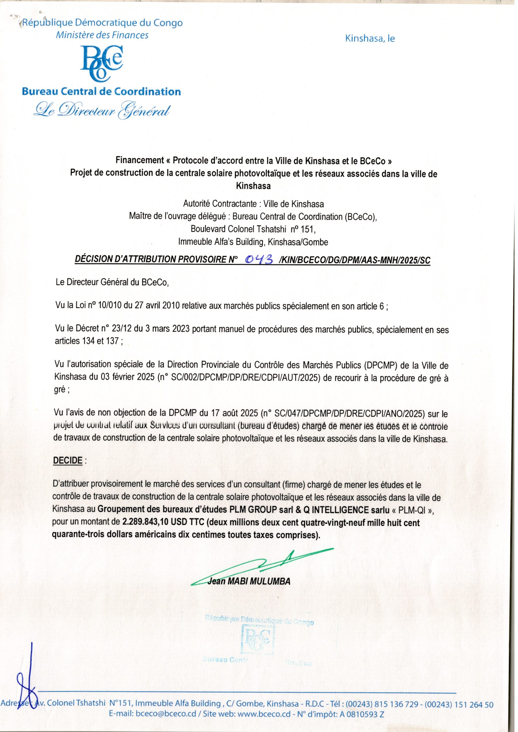 Attribution provisoire accordée au Groupement des bureau d’études PLM GROUP relative au services d’un consultant (firme) chargé de mener les études et le contrôle de travaux de construction de la central solaire photovoltaïque et les réseaux associés dans la ville de Kinshasa