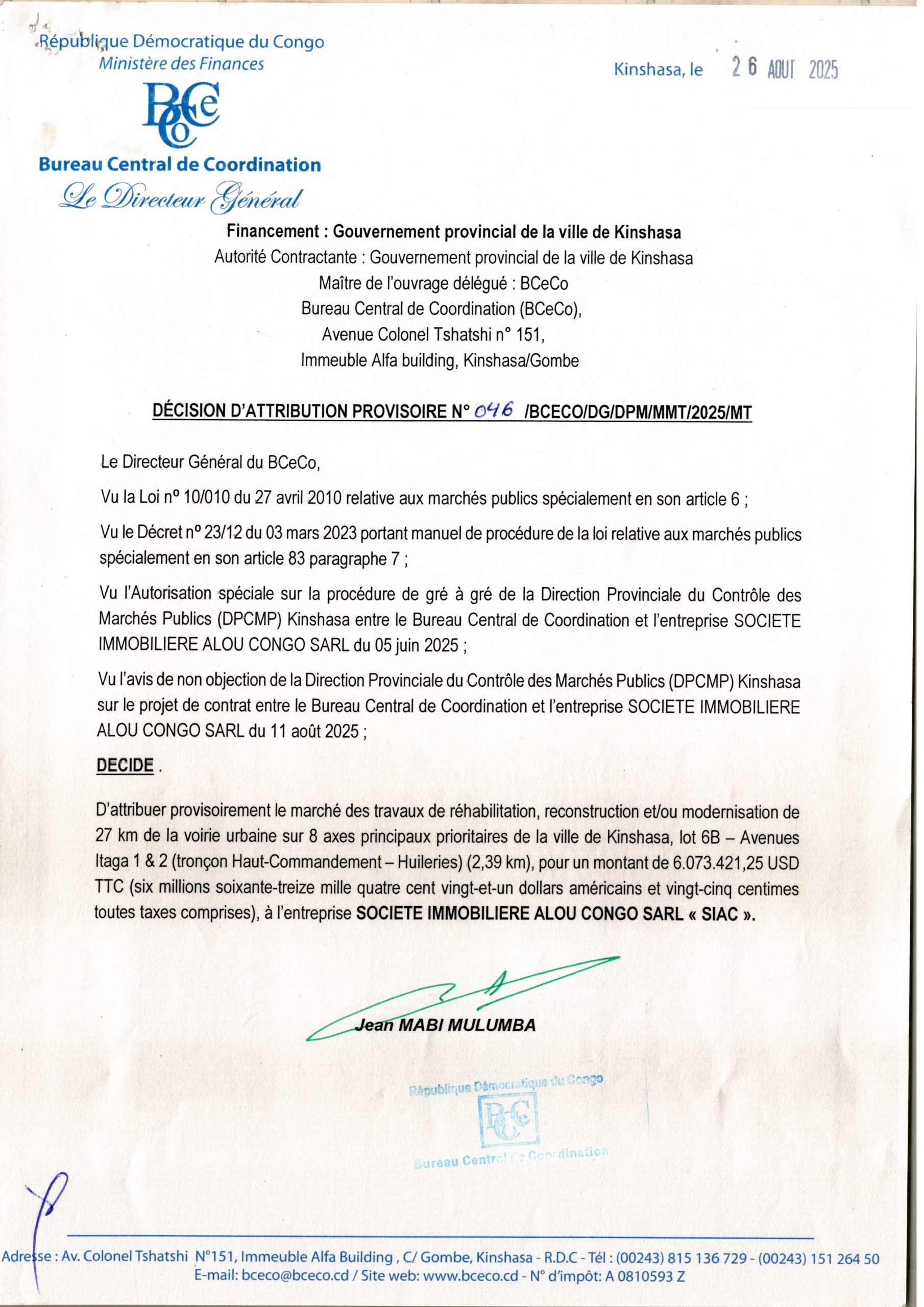 Attribution provisoire accordée à la société “SOCIETE IMMOBILIERE ALOU CONGO SARL” le marché relatif aux travaux de réhabilitation, reconstruction et/ou modernisation de 27km de la voirie urbaine sur 8 axes principaux prioritaires de la Ville de Kinshasa, lot6B-Avenues Itaga 1 & 2 (tronçon Haut-Commandement-Huileries)(2.39km).