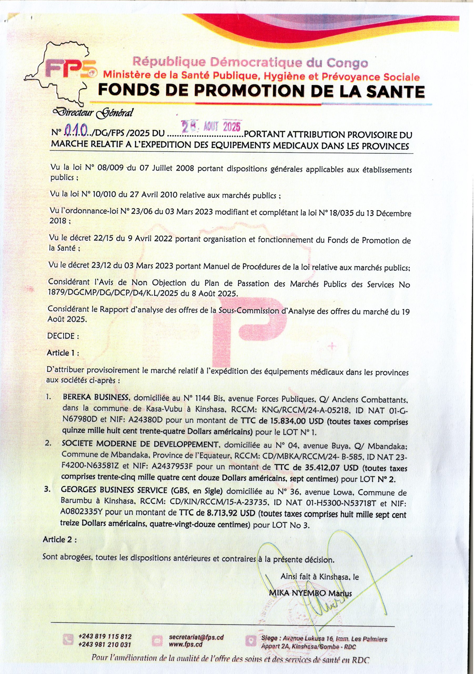 Attribution provisoire du marché relatif à l’expédition des équipements medicaux dans les provinces.
