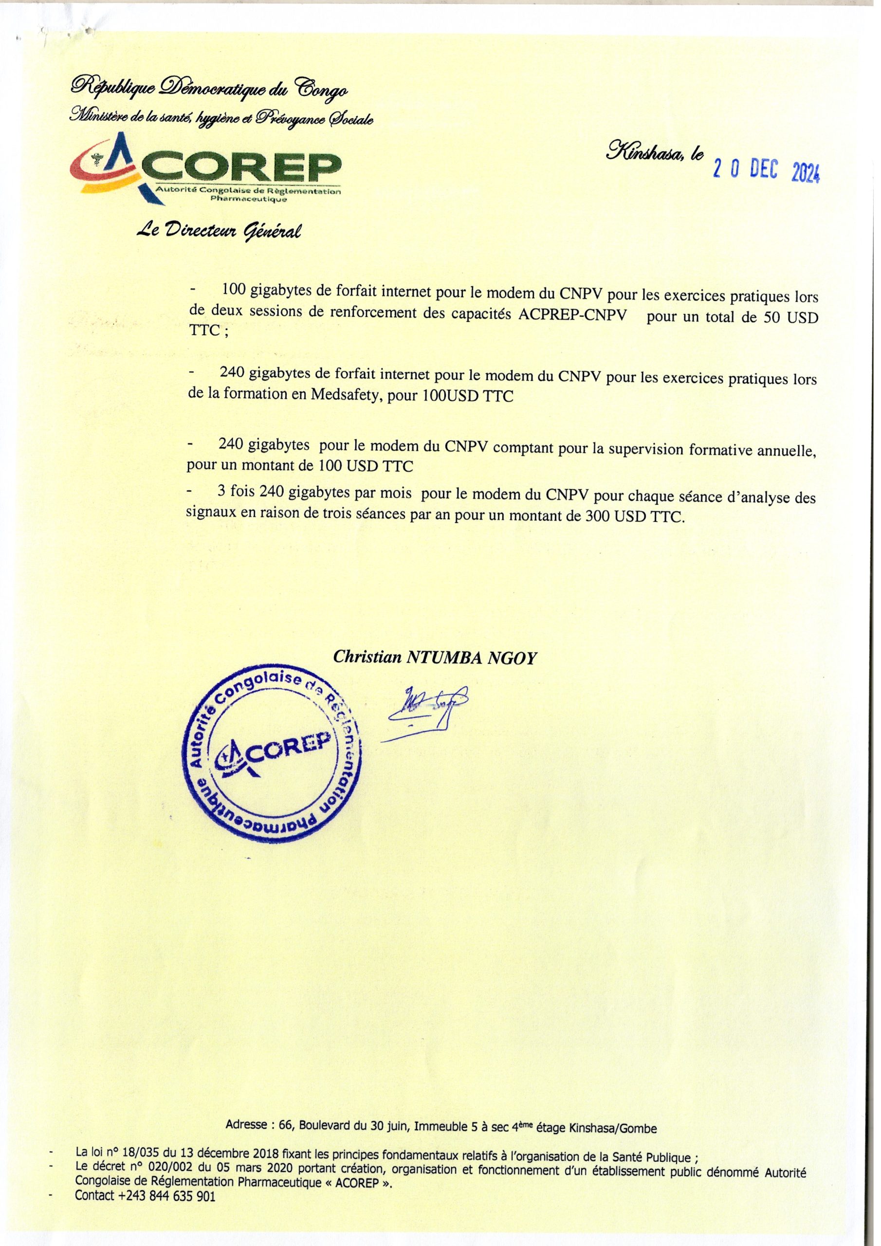 Décision d’attribution provisoire accordée à la société Vodacom Congo relative au recrutement d’un prestataire pour la fourniture de la connexion internet au profit de l’ACOREP.