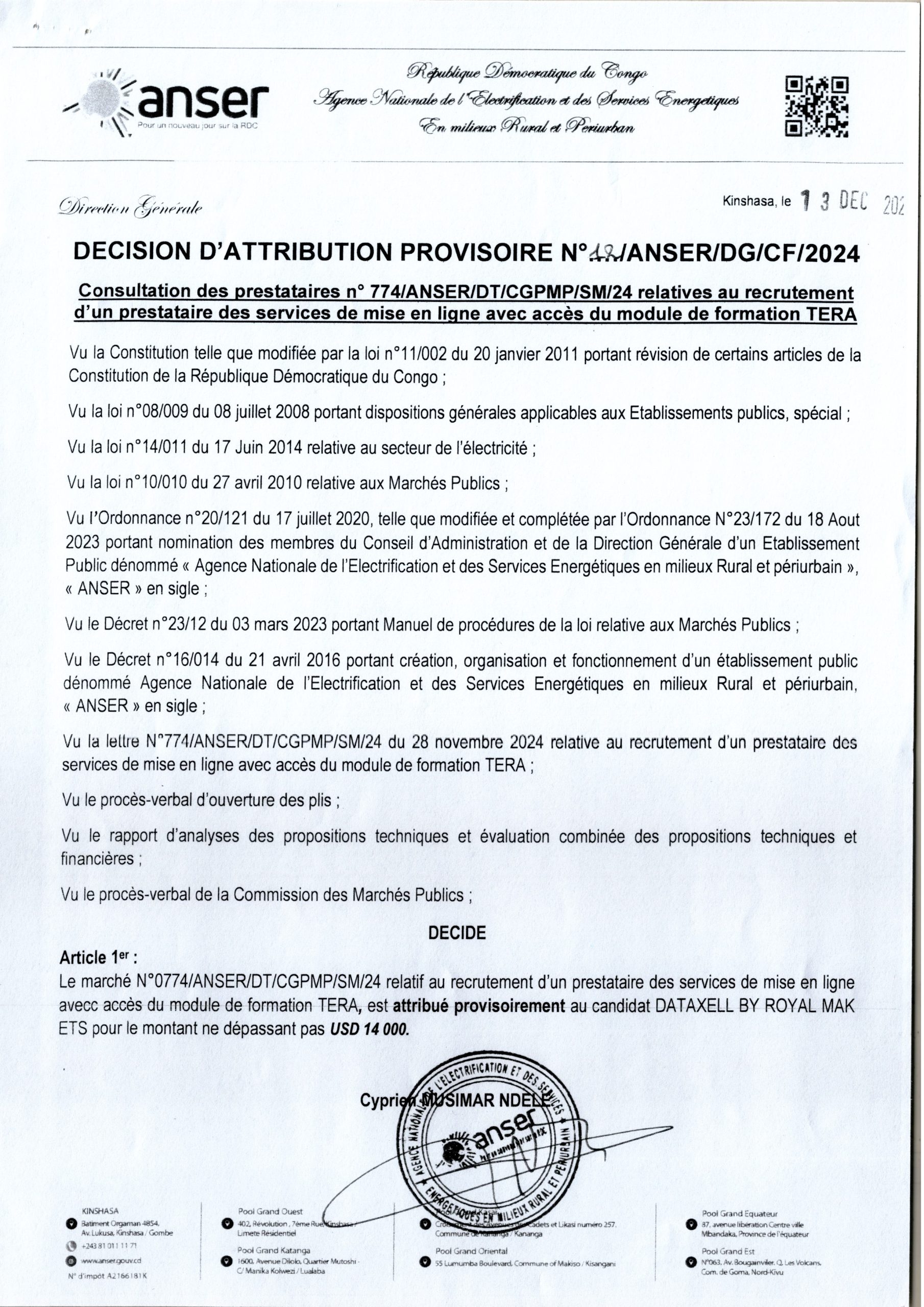 Attribution Provisoire relatif au recrutement d’un prestataire des services de mise en ligne avec accès du module de formation TERA au candidat DATAXELL BY ROYAL MAK ETS