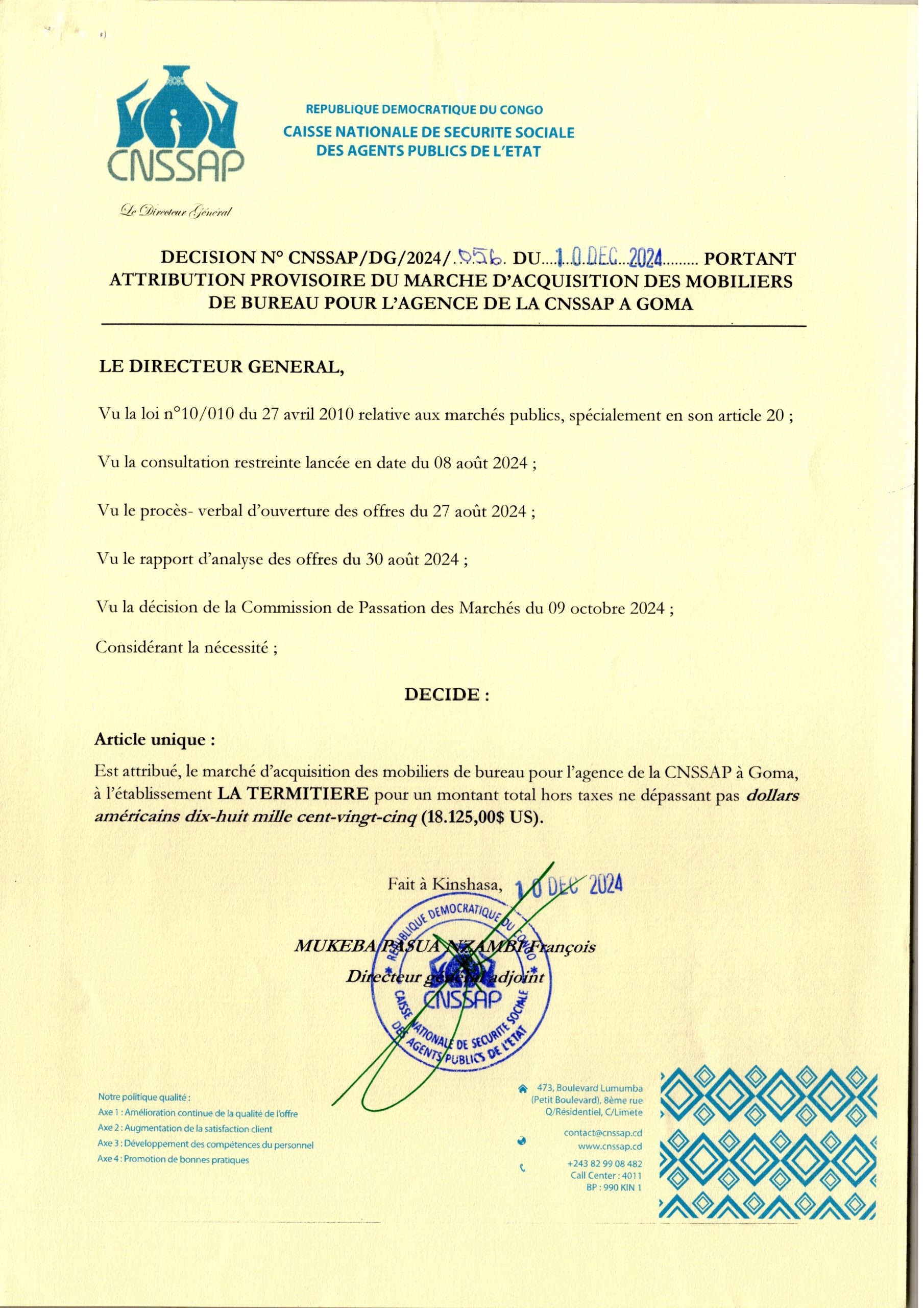 Attribution provisoire accordée à l’établissement LA TERMITIERE relative à l’acquisition des mobiliers de bureau pour l’agence de la CNSSAP à Goma.