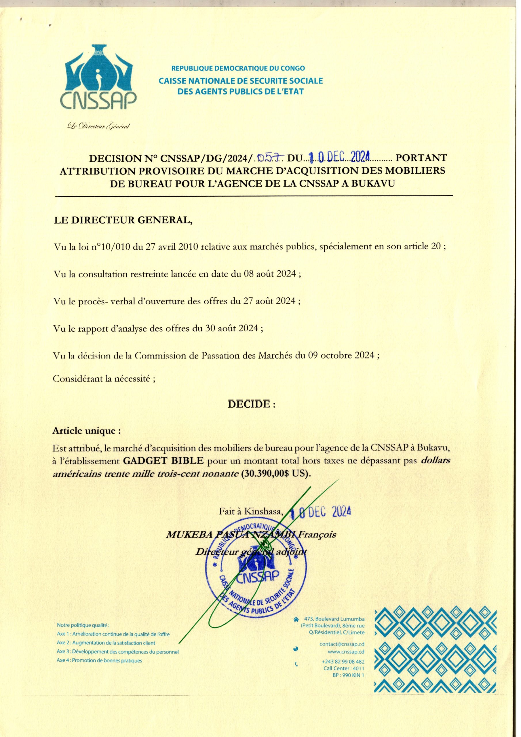 Attribution provisoire accordée à l’établissement GADGET BIBLE relative à l’acquisition des mobiliers de bureau pour l’agence de la CNSSAP à Bukavu.