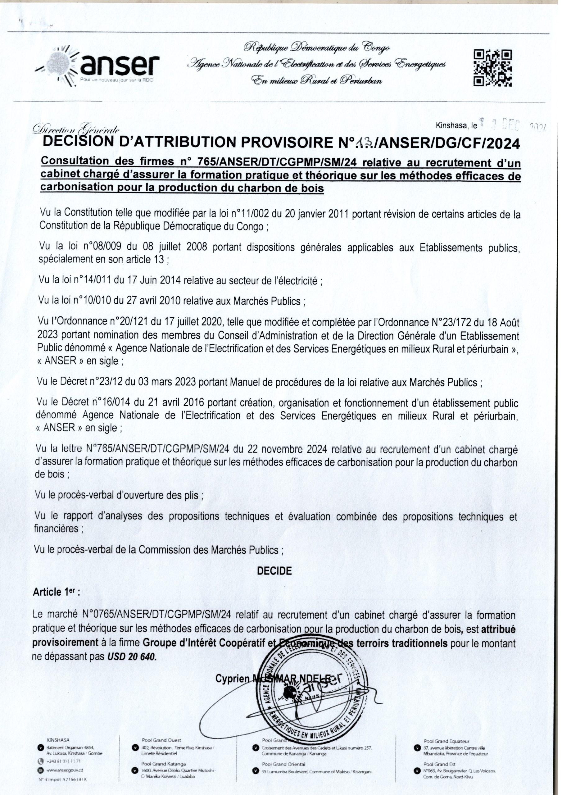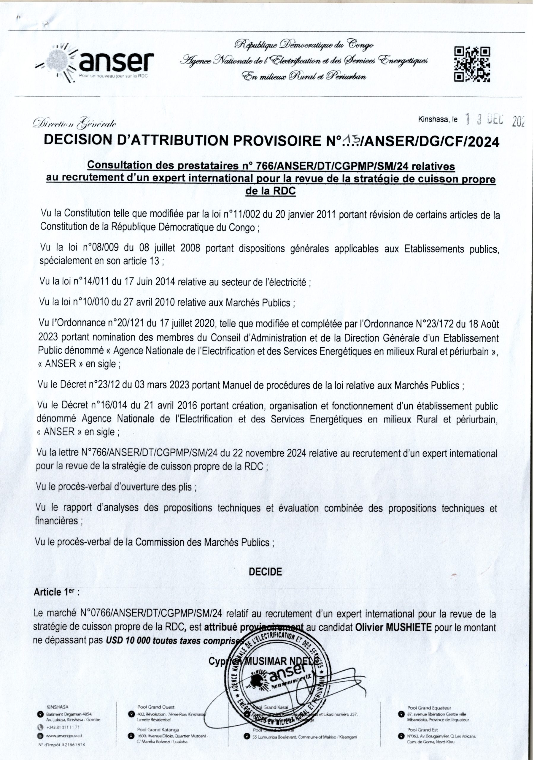 Attribution provisoire accordée à “Mr Olivier MUSHIETE” le marché relatif au recrutement d’un expert international pour la revue propre de la stratégie de cuisson propre de la RDC