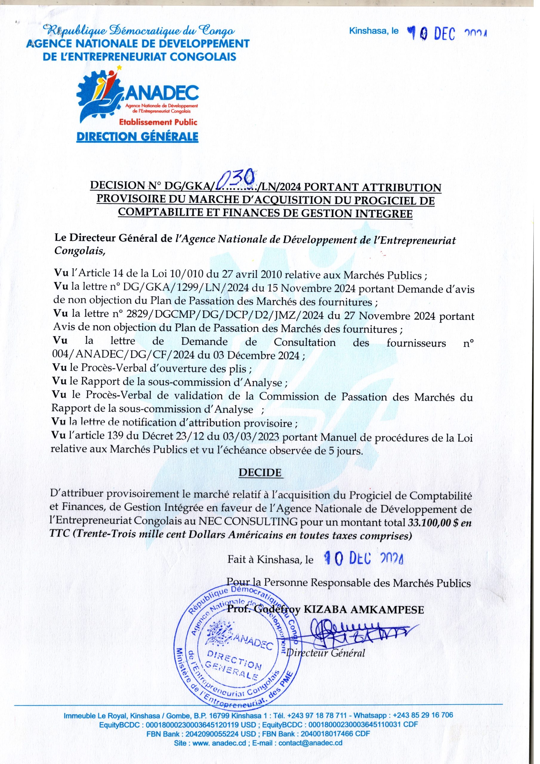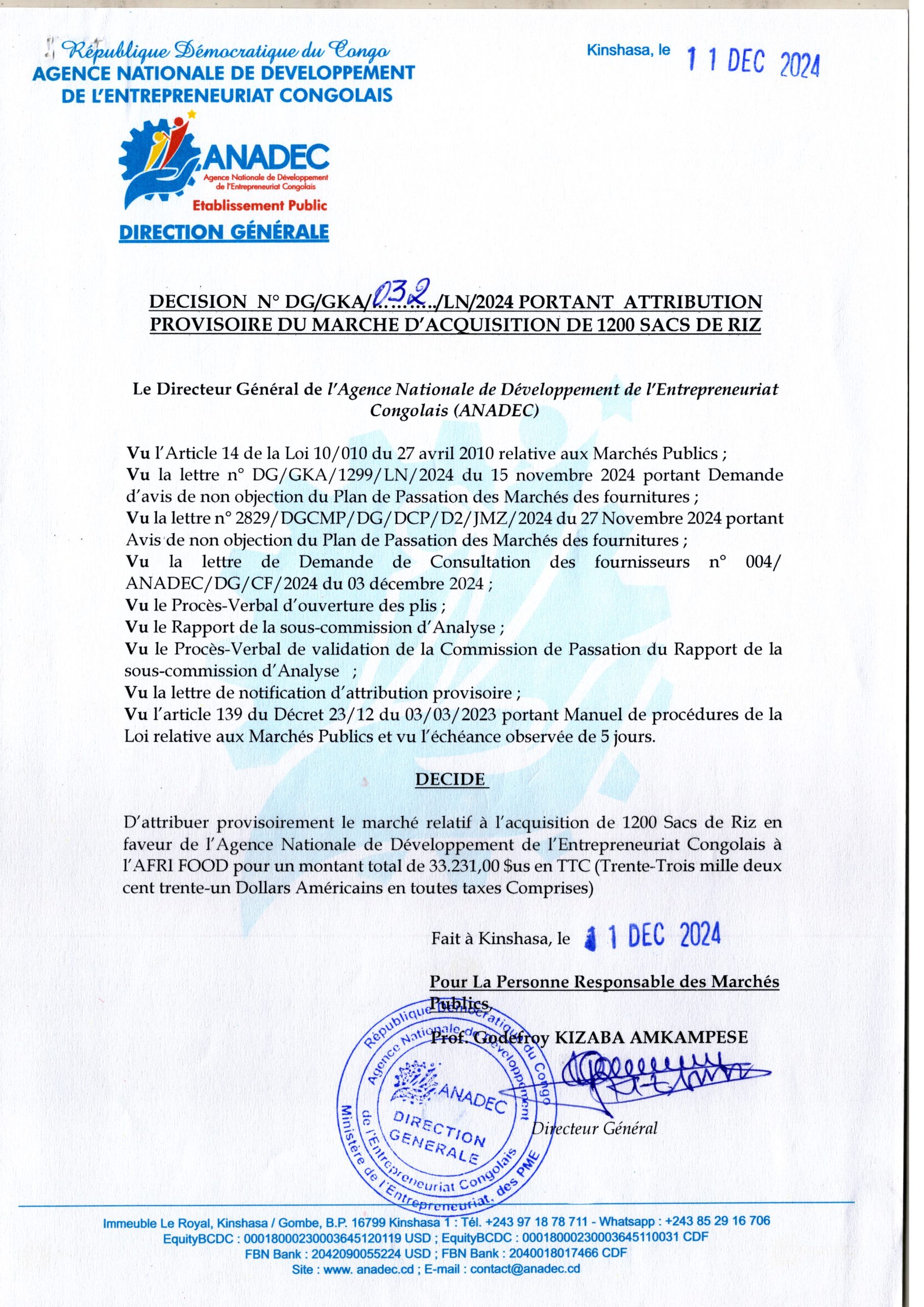 Attribution Provisoire du Marché relatif à l’Acquisition de Colis de Fin d’Année en faveur du Fonds de Garantie de l’Entrepreneuriat au Congo au Fournisseur CHAMBRE FROIDE ELIKYA