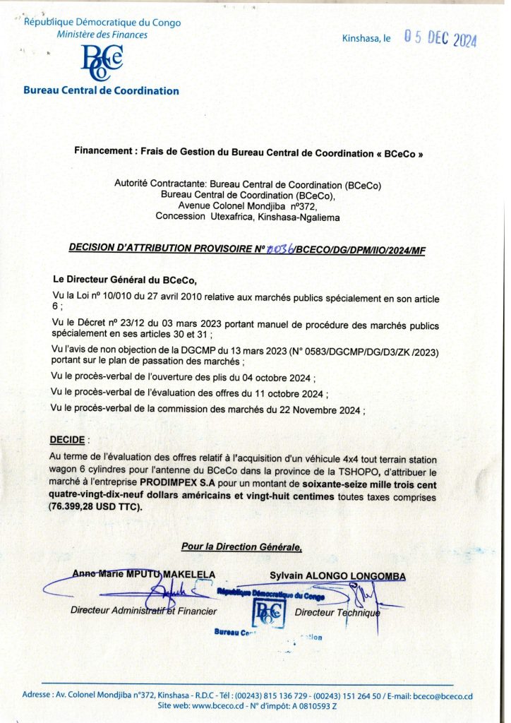 Attribution provisoire du marché d’acquisition d’un véhicule 4×4 tout terrain, station wagon, 6 cylindre pour l’antenne de BCECO en faveur de l’entreprise PRODIMPEX S.A