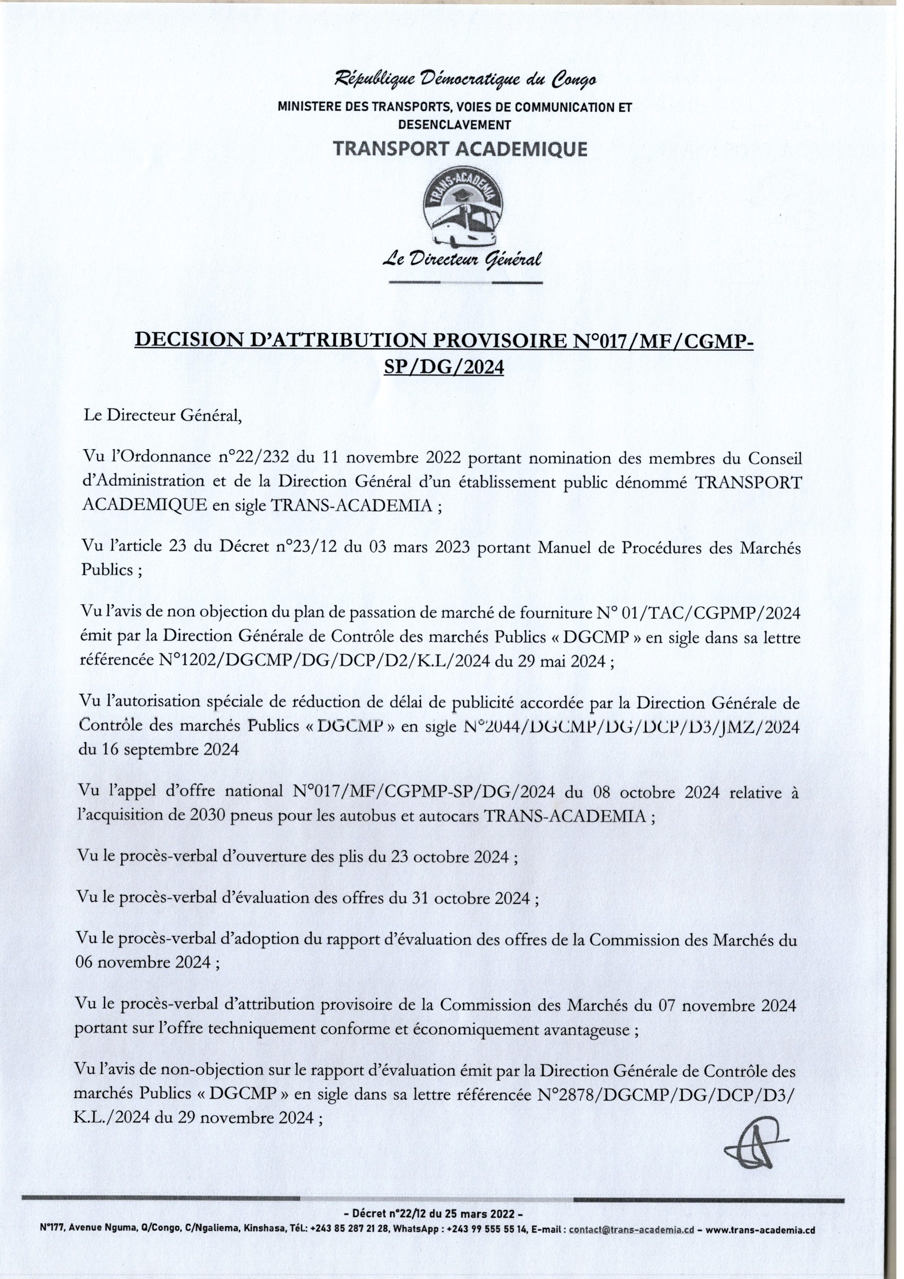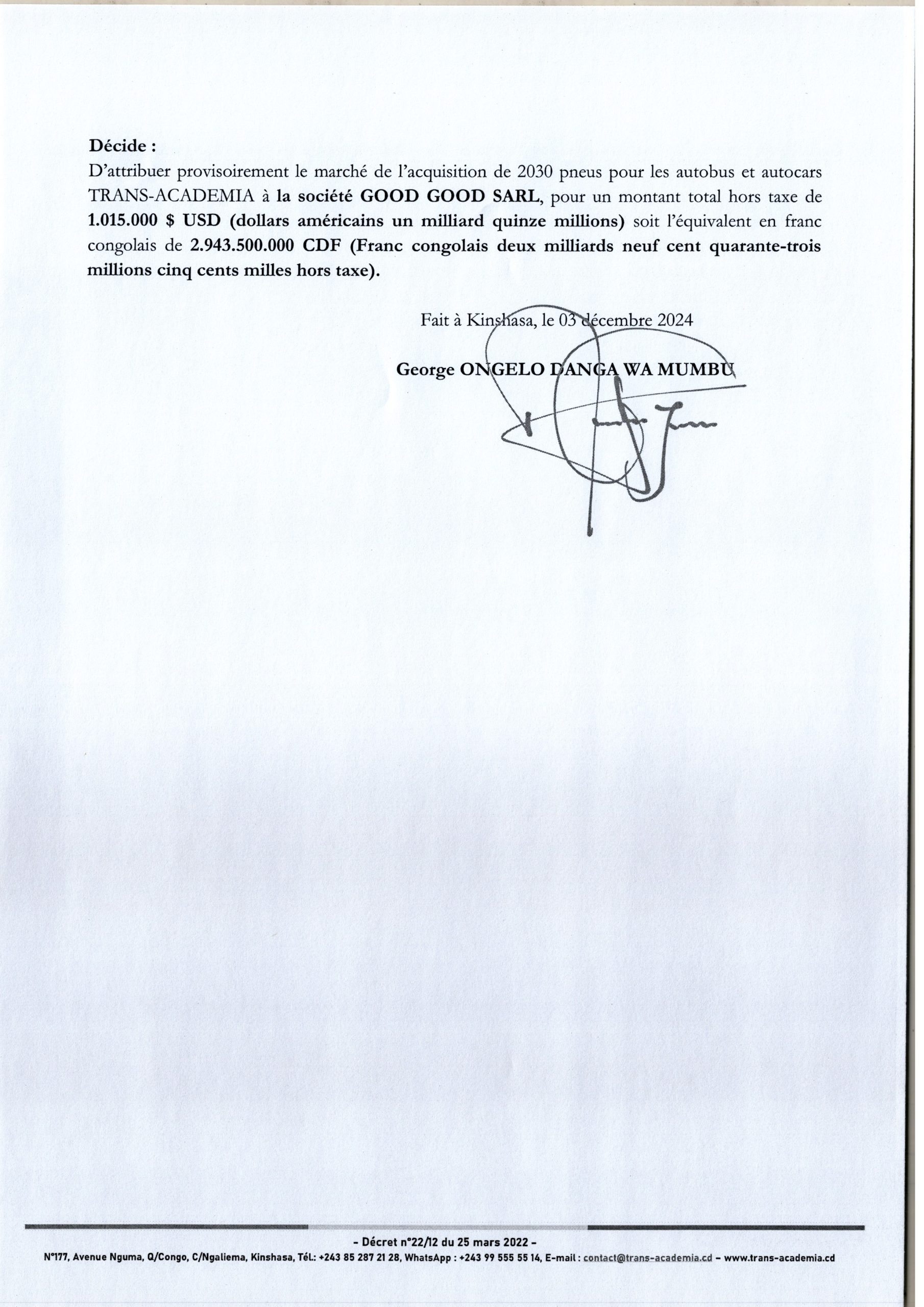 Attribution provisoire accordée à la Société GOOD GOOD SARL marché relative à l’acquisition de 2030 pneus pour les autobus et autocars TRANS-ACADEMIA.