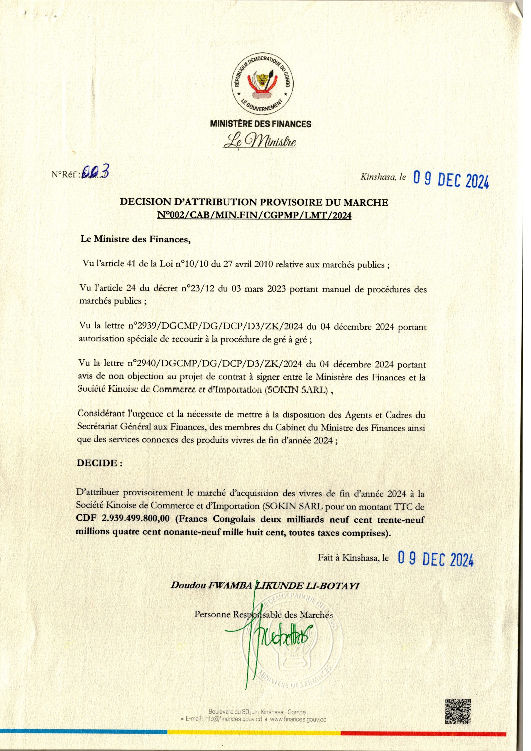 Attribution provisoire accordée à la Société SOKIN SARL relative à l’acquisition des vivres de fin d’année 2024.