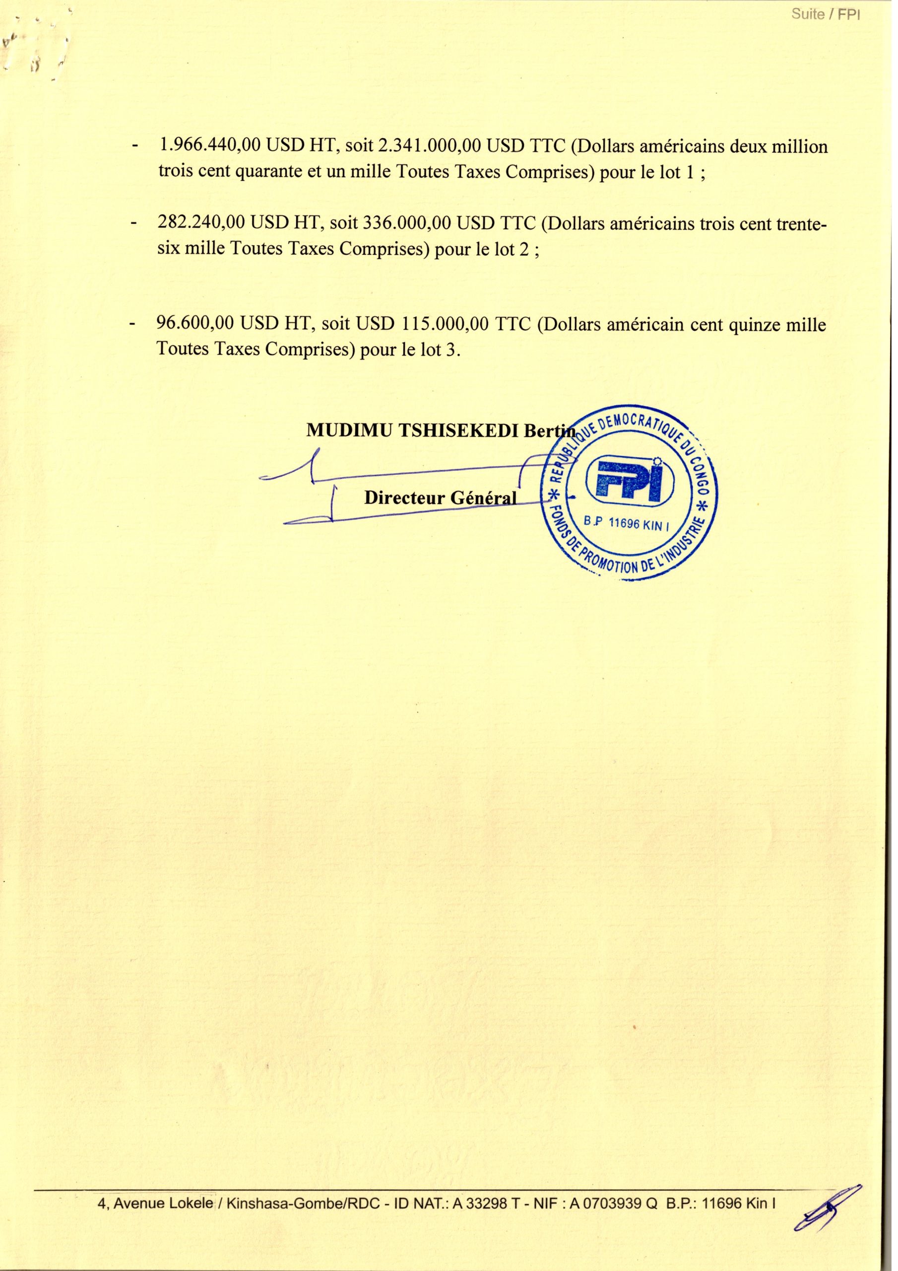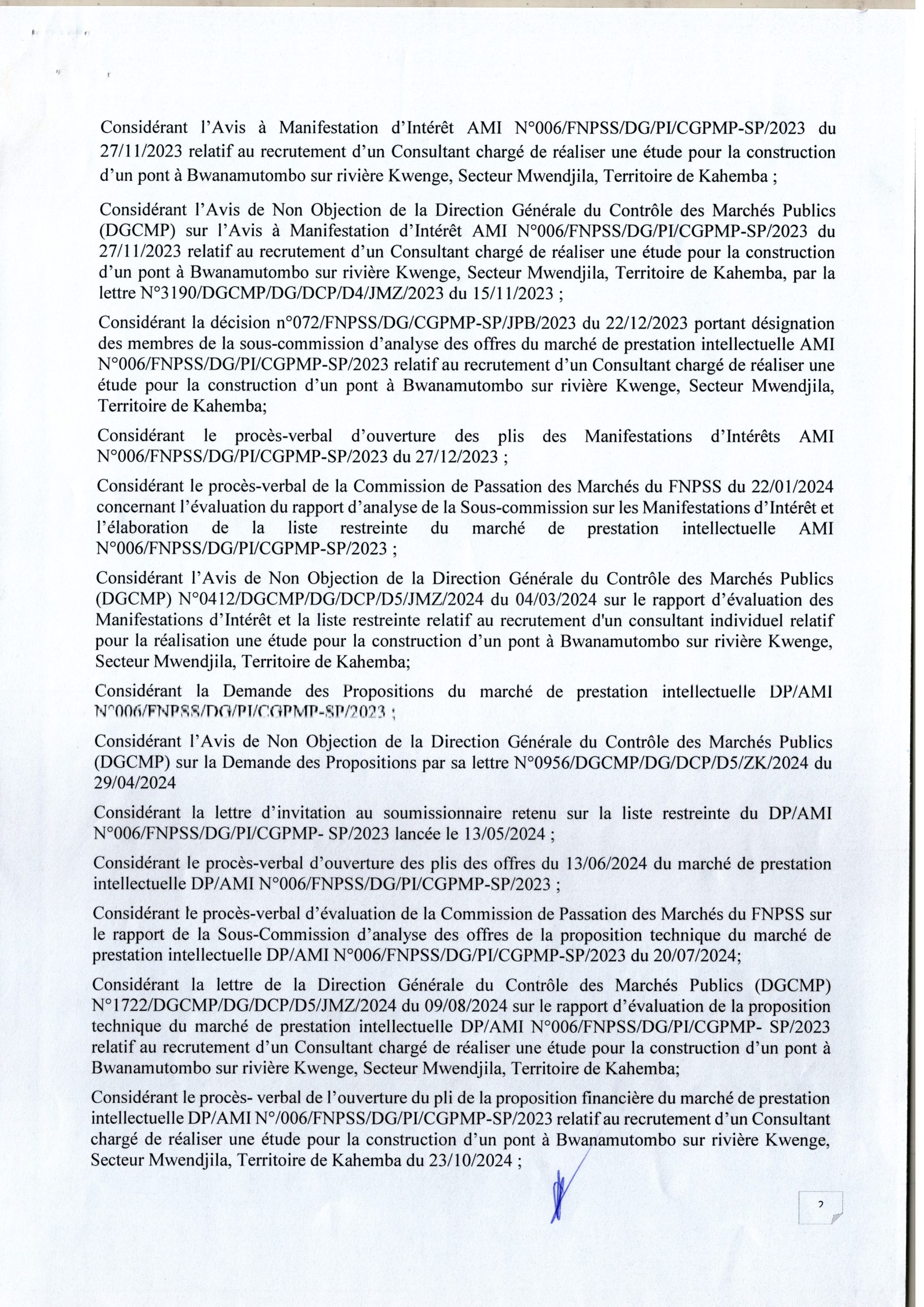 Décision d’attribution provisoire accordée à la Société RETRAV Sarl relative au recrutement d’un consultant chargé de réaliser une étude pour la construction d’un pont a BWANAMUTOMBO sur rivière KWENGE, secteur MWENDJILA, Territoire de KAHEMBA.
