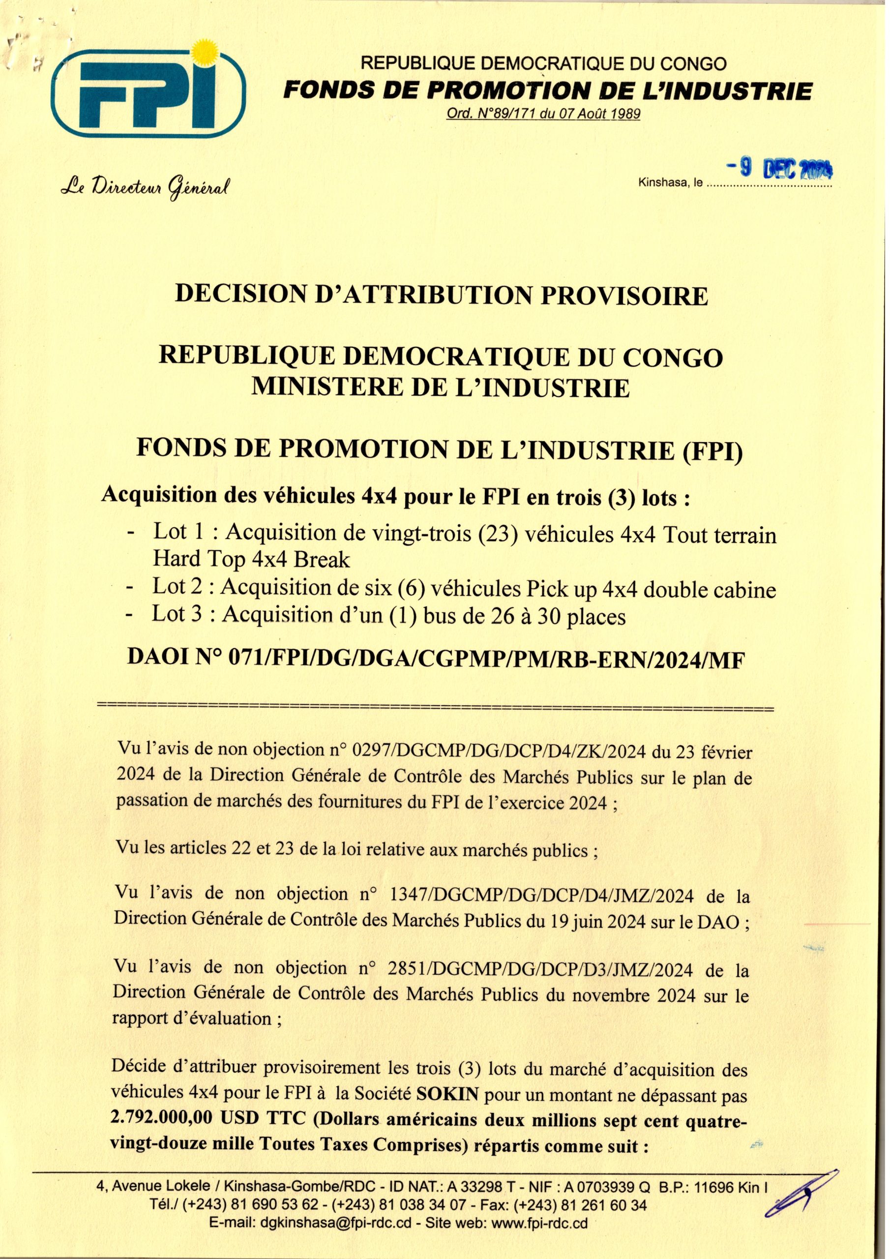 Attribution provisoire accordée à la Société SOKIN relative à l’acquisition des véhicules 4×4 pour le FPI repartis en trois (03) distincts.