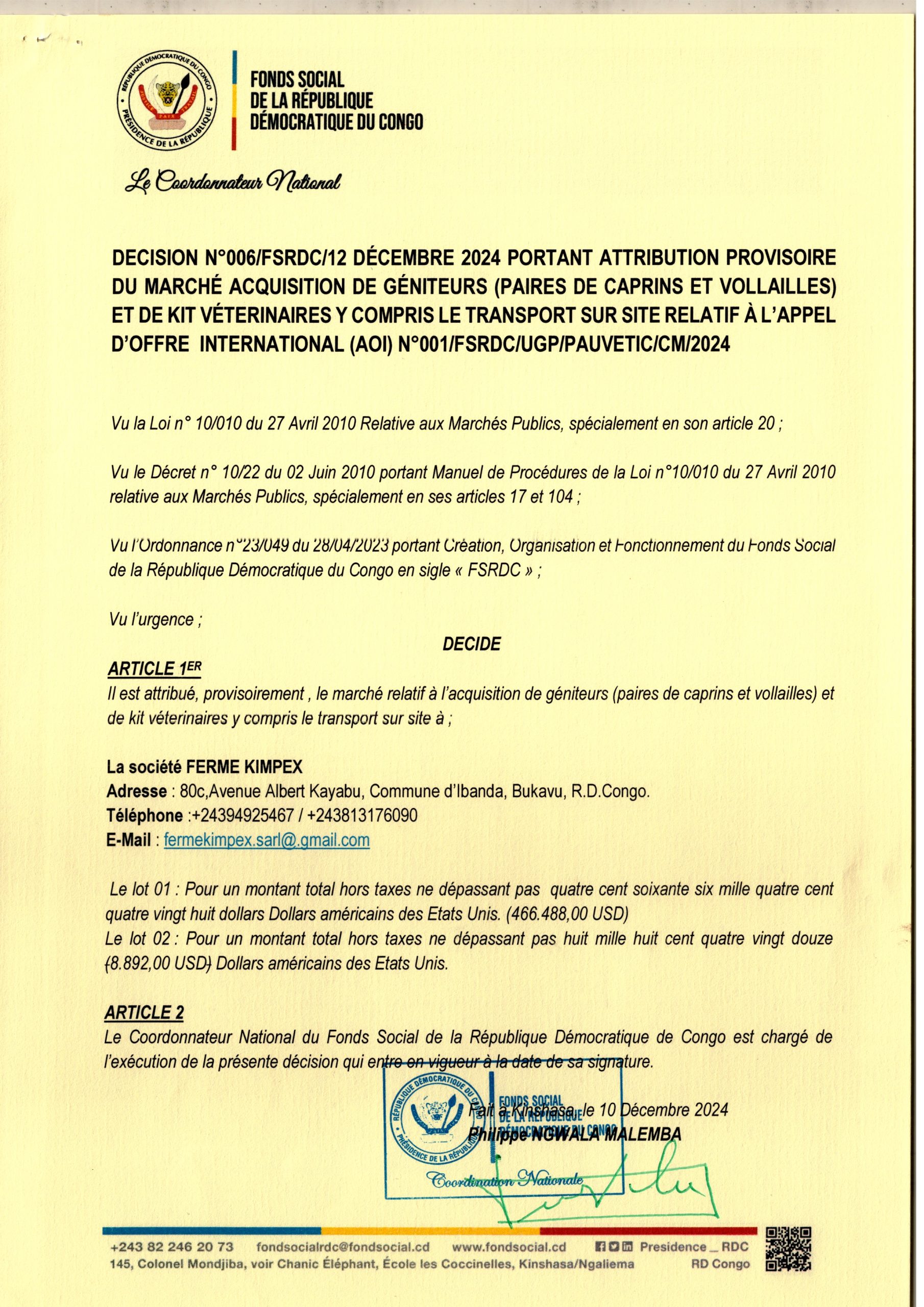Attribution provisoire accordée à la Société FERME KIMPEX relative à l’acquisition de géniteurs (Paires de caprins et volailles) et de Kit vétérinaires