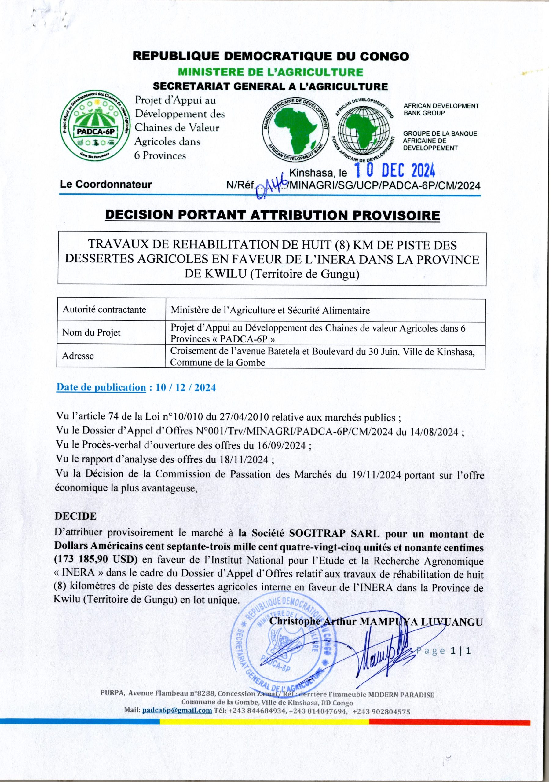 Décision d’attribution provisoire accordée à la Société SOGITRAP SARL relative aux travaux de réhabilitation de huit (8) KM de piste des dessertes agricoles en faveur de l’INERA dans la province de KWILU.