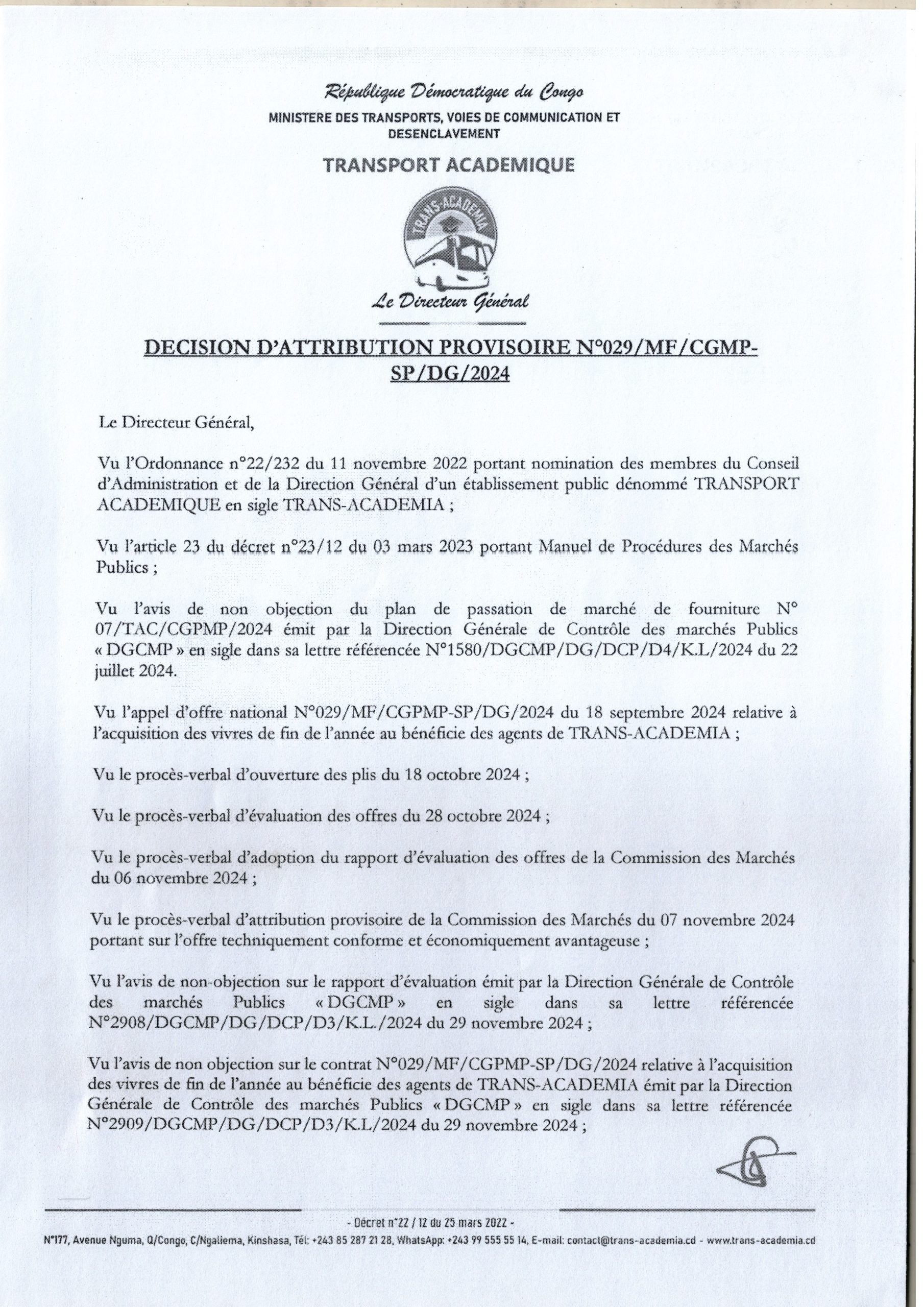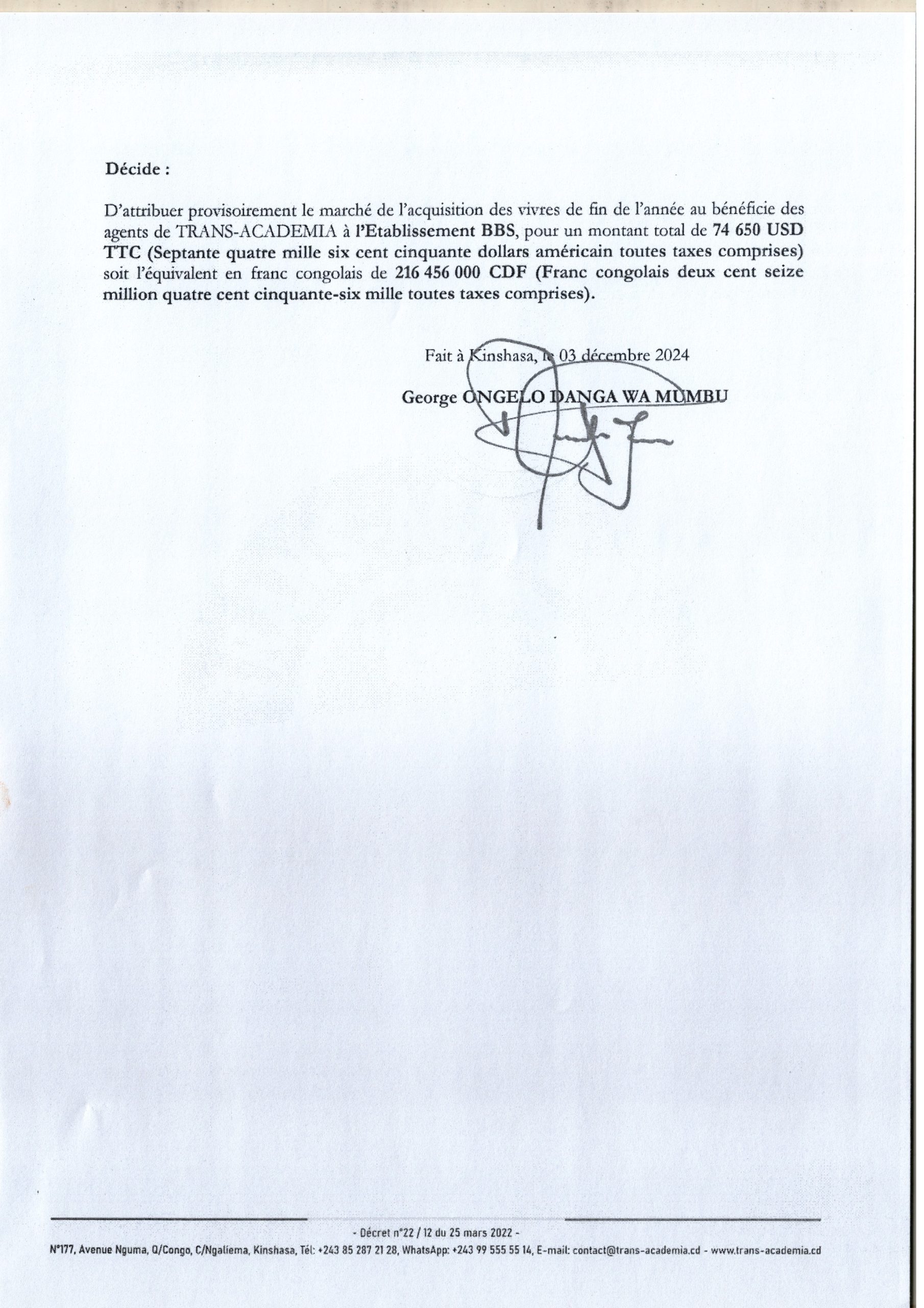 Attribution provisoire accordée à l’Etablissement BBS marché relative à l’acquisition des vivres de fin de l’année au bénéficie des agents de TRANS-ACADEMIA.