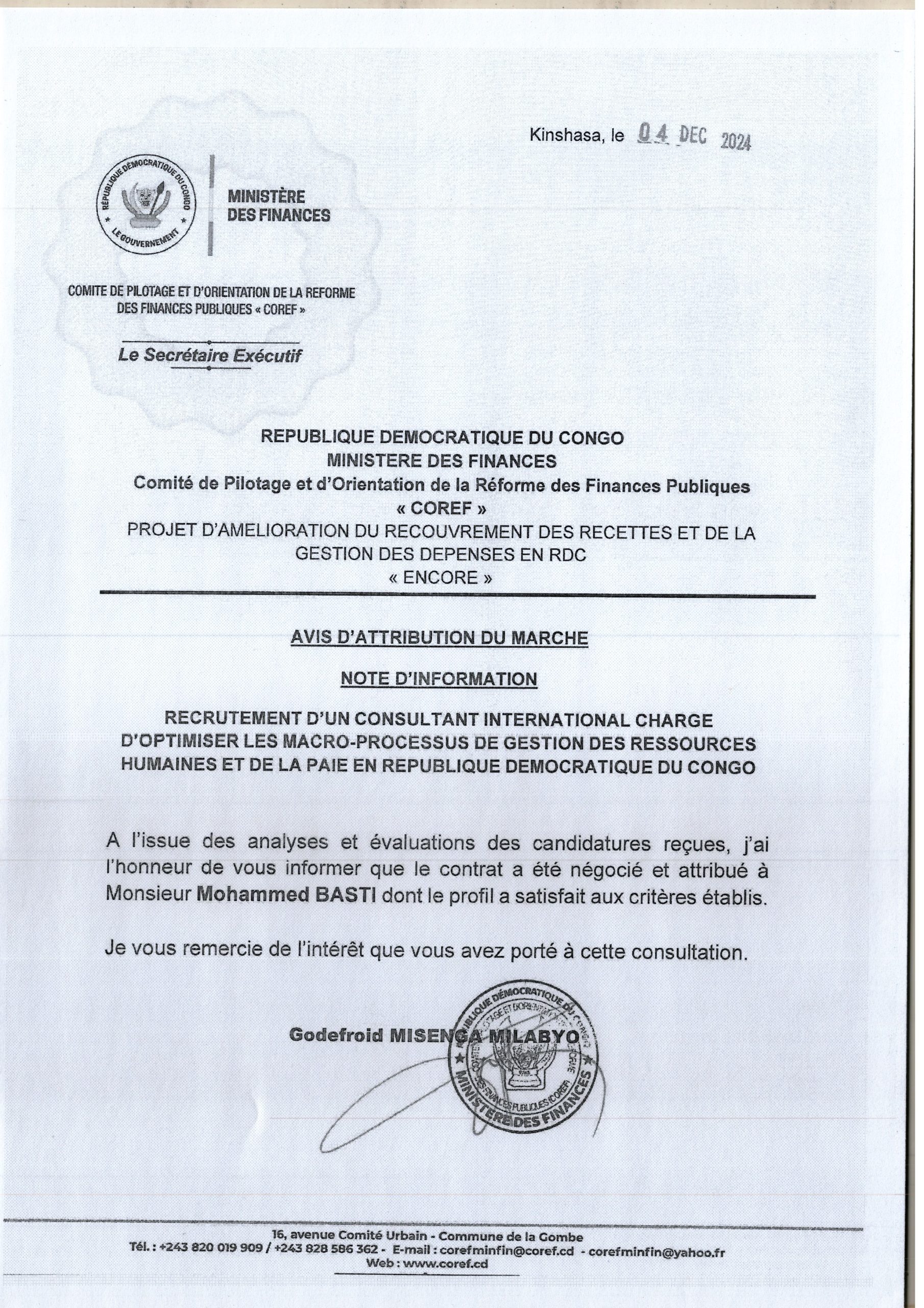 Avis d’attribution du marché relatif au recrutement d’un consultant international charge d’optimiser les macro-processus de gestion des ressources humaines et de la paie en Rdc est accordée à Mr Mohammed BASTI.