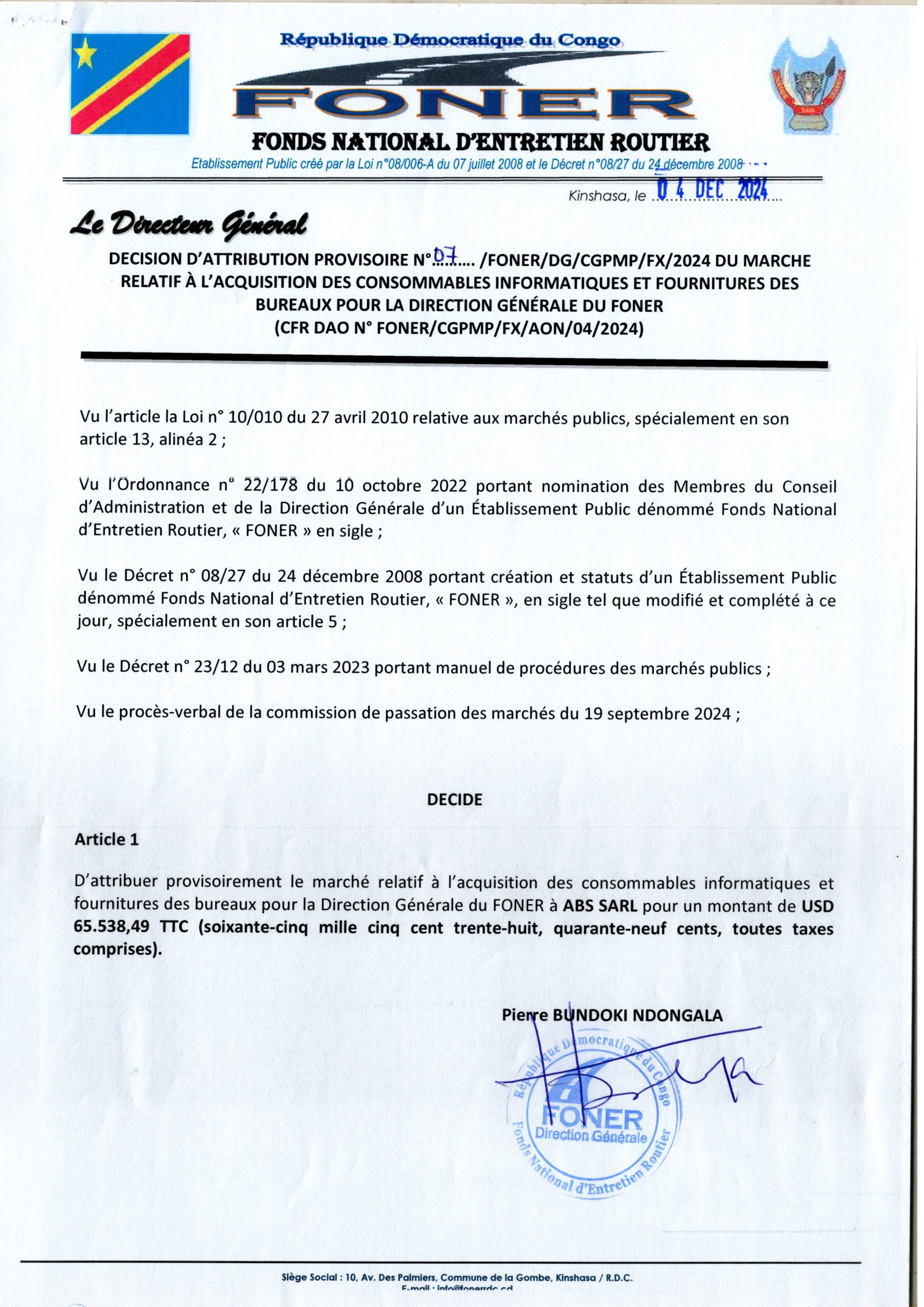Attribution provisoire accordée à ABS SARL relative à l’acquisition des consommables informatiques et fournitures des bureaux pour la Direction Générale du FONER.