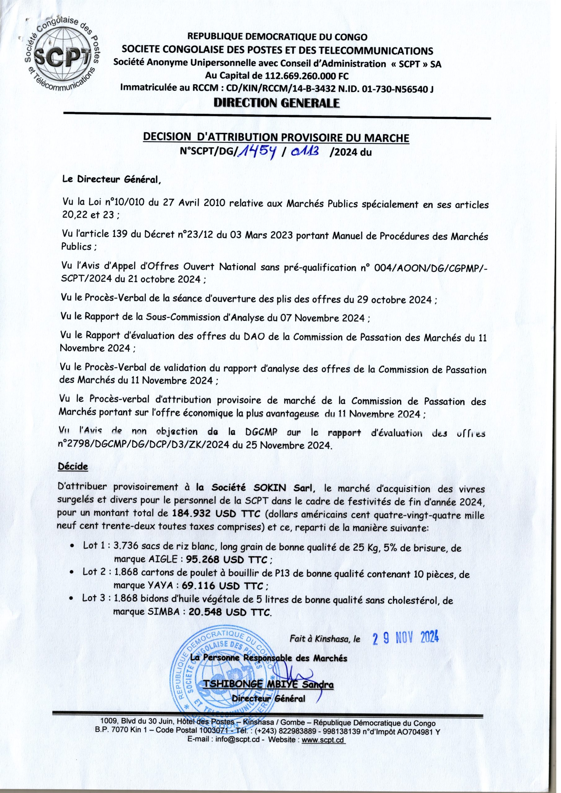 Attribution provisoire accordée à la Société SOKIN Sarl relative à l’acquisition des vivres surgelés et divers pour le personnel de la SCPT dans le cadre de festivités de fin d’année 2024 (lot 1,2 et 3).