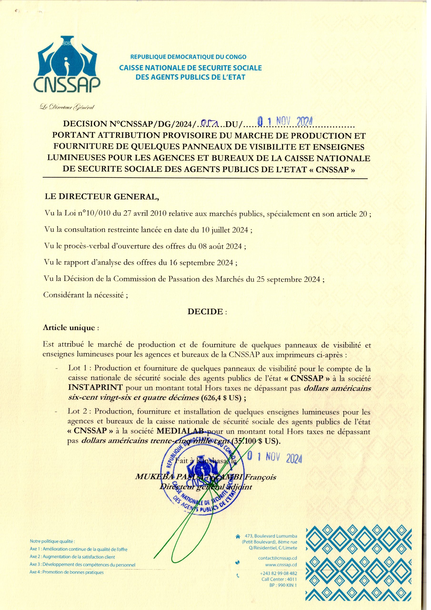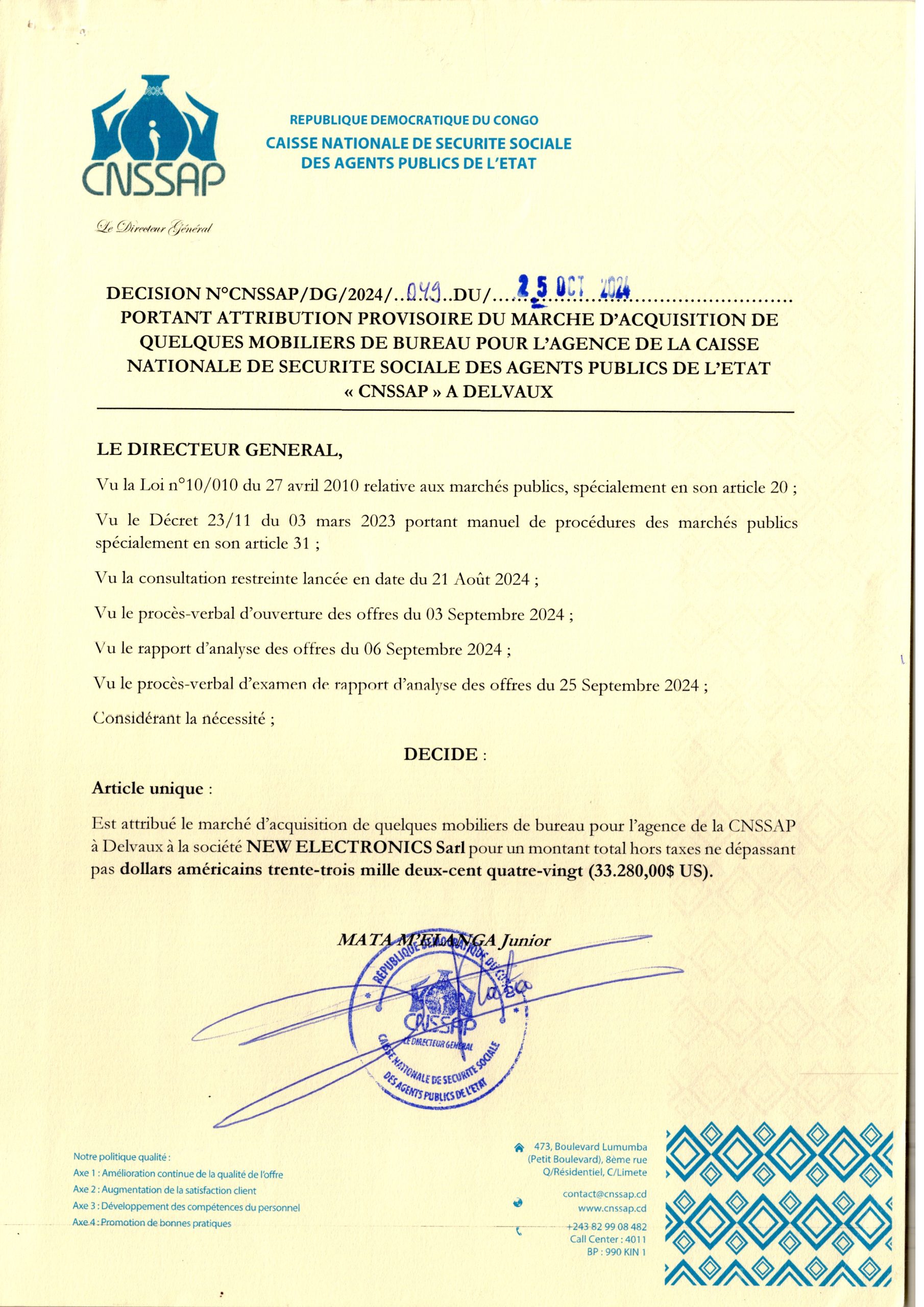 Avis d’attribution provisoire accordée à la Société PAKAM relative à l’acquisition de Tracteurs Agricoles et ses Accessoires(Remorque ,Charrue et Herse),(lot2) au profit de la Reserve Stratégique Générale, Service Spécialisé de la Présidence de la République.