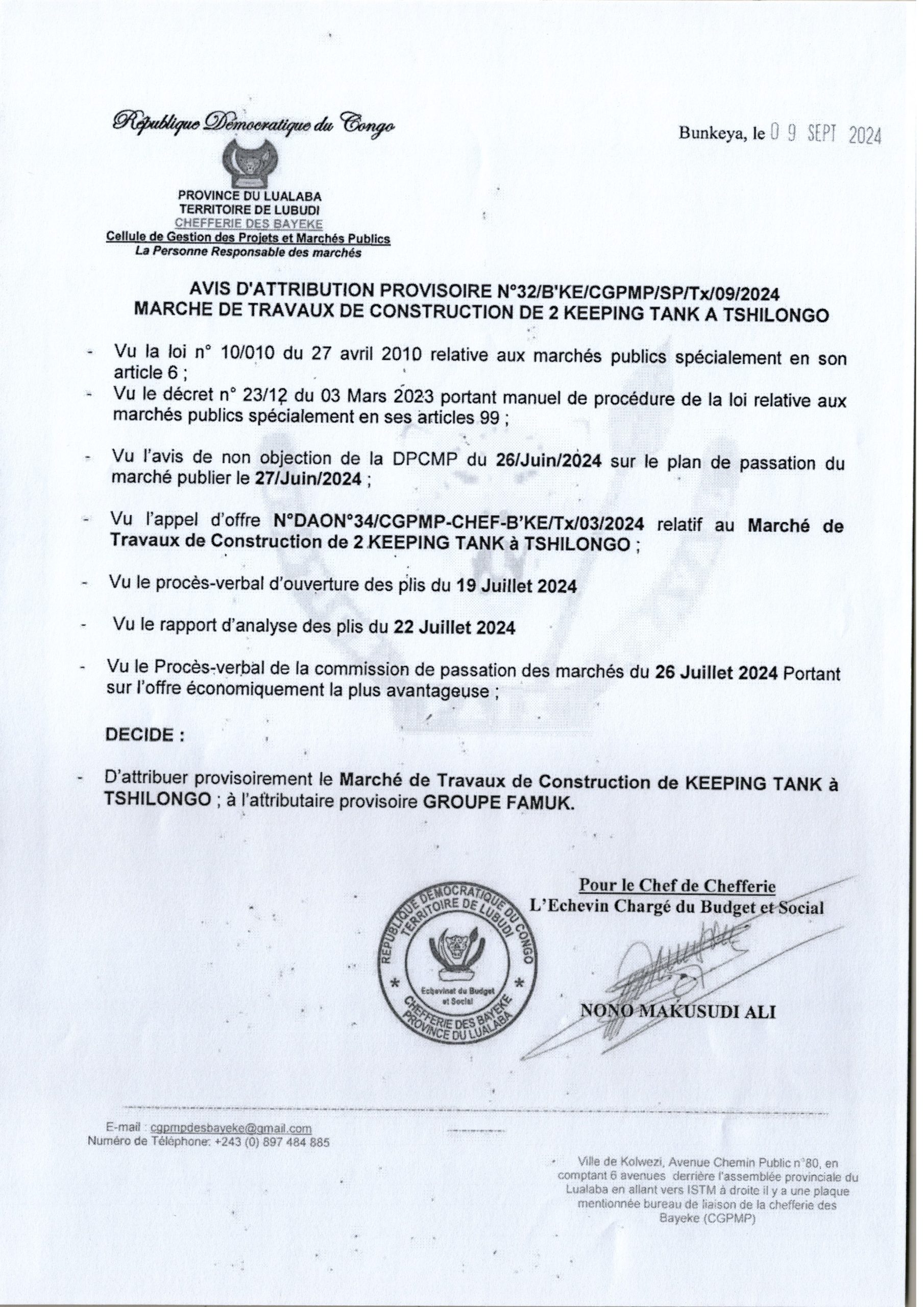 Décision d’attribution provisoire accordée au Group FAMUK relative aux travaux de construction de KEEPING TANK à TSHILONGO.