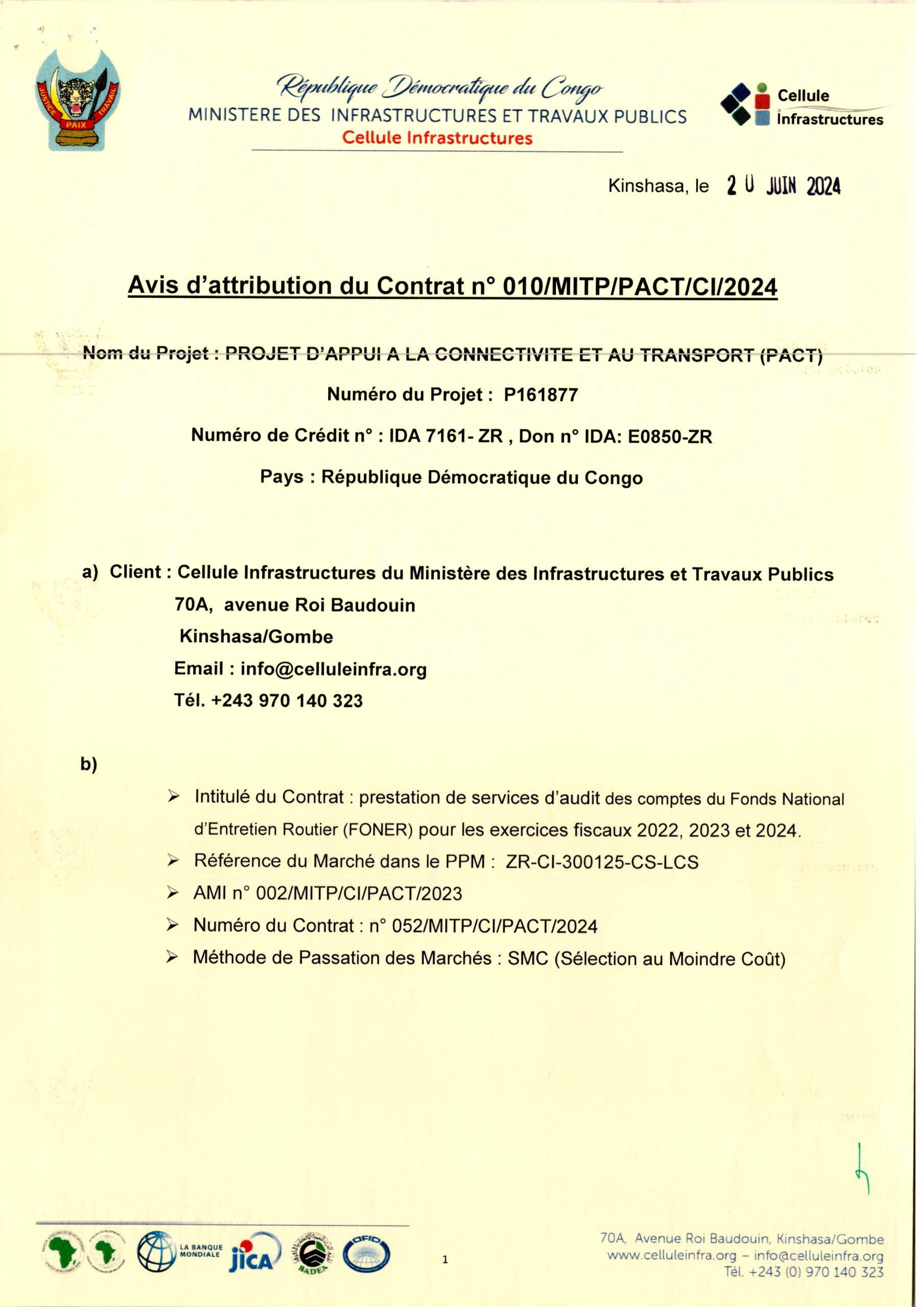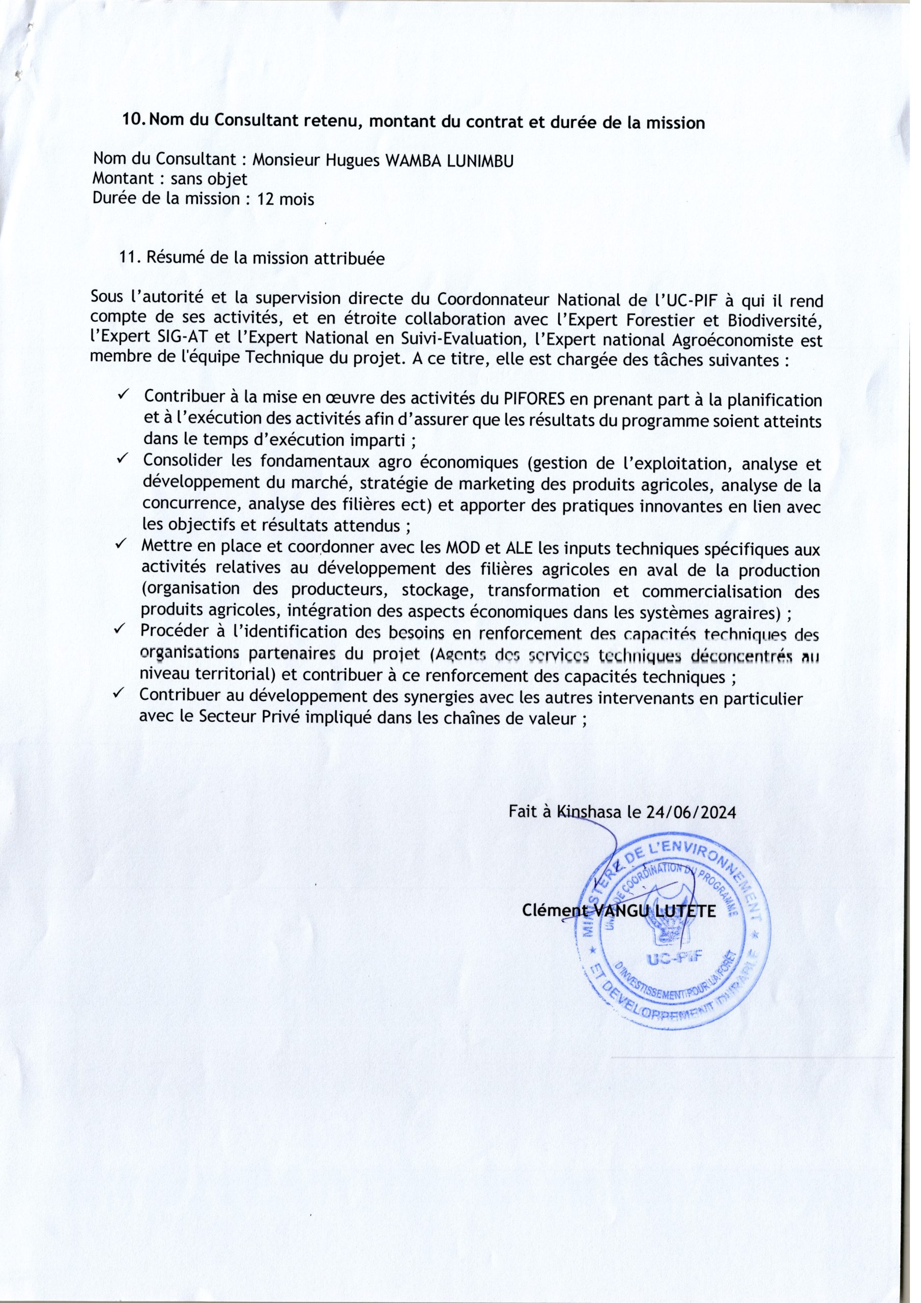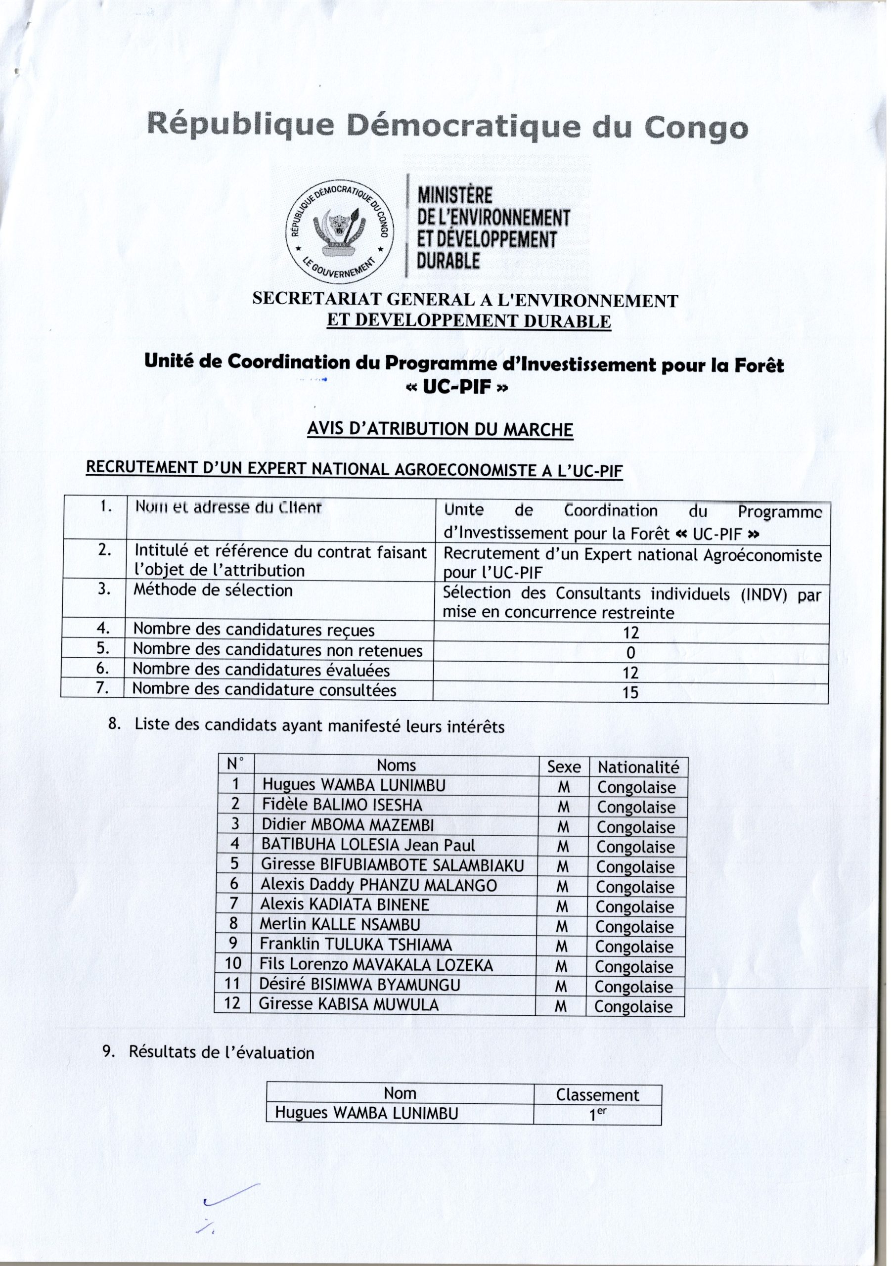 AVIS D’ATTRIBUTION DU MARCHÉ ACCORDÉE À MR HUGUES WAMBA LUNIMBU RELATIF AU RECRUTEMENT D’UN EXPERT NATIONAL AGROÉCONOMISTE À L’UC-PIF.