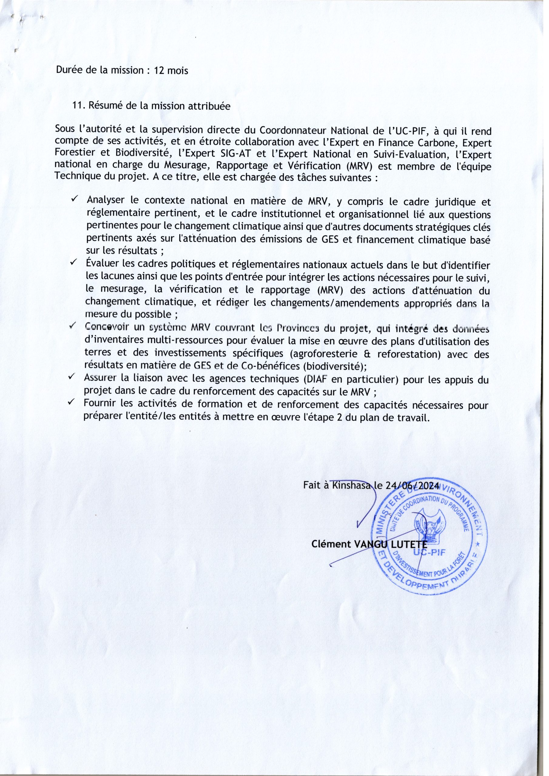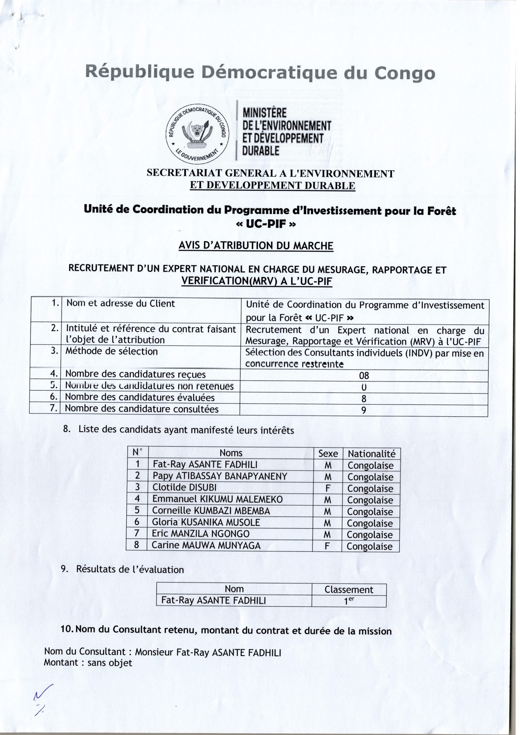 AVIS D’ATTRIBUTION DU MARCHÉ ACCORDÉE À MR FAT-RAY ASSANTE FADHILI RELATIF AU RECRUTEMENT D’UN EXPERT NATIONAL EN CHARGE DU MESURAGE, RAPPORTAGE ET VÉRIFICATION (MRV) A L’UC-PIF.