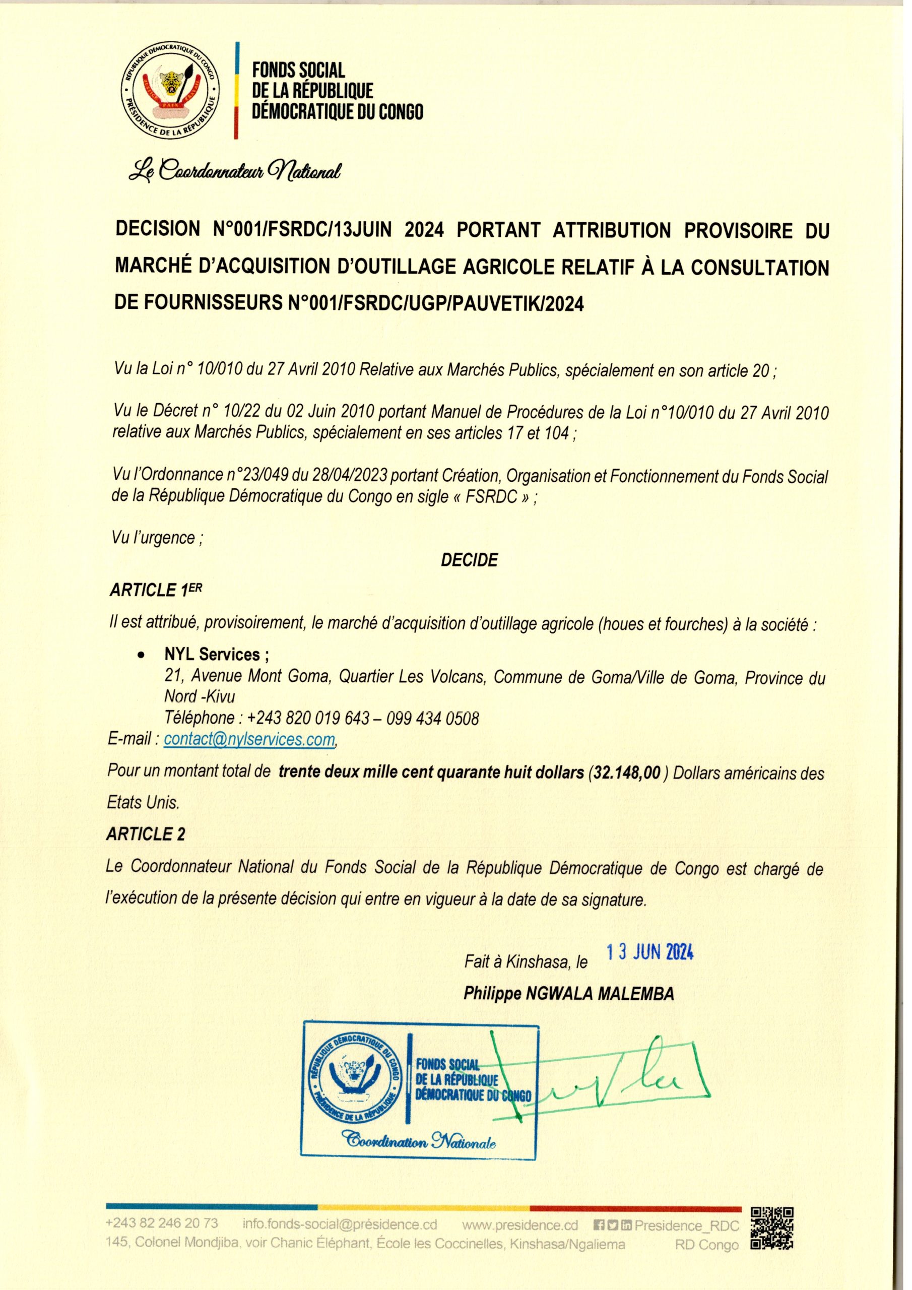 Décision d’attribution accordée à la société NYL Services relative à l’acquisition d’outillage agricole (houses et fourches)