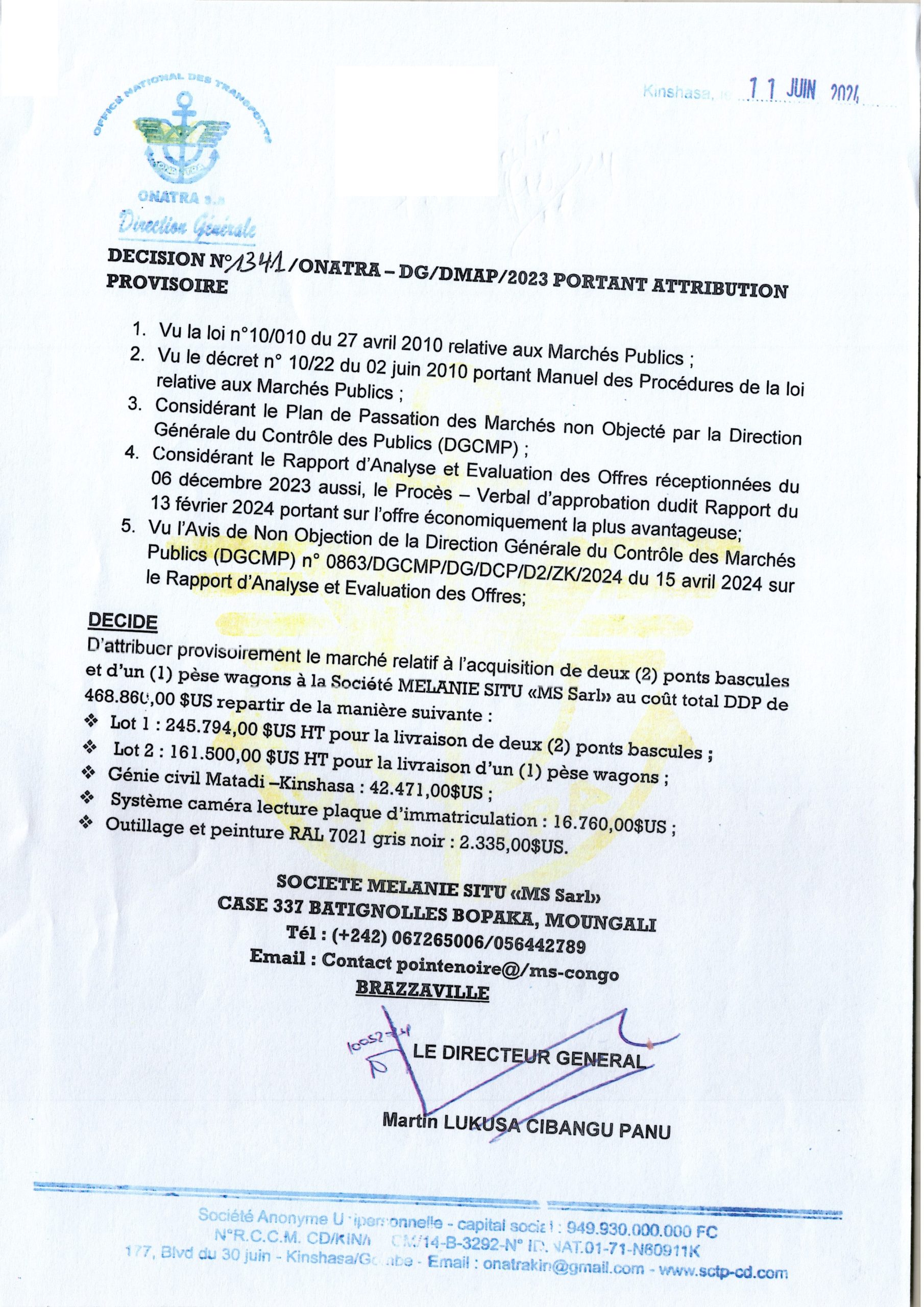 Attribution provisoire accordée à la société MELANIE SITU relative à l’acquisition de deux (2) ponts bascules et d’un (1) pèse wagons