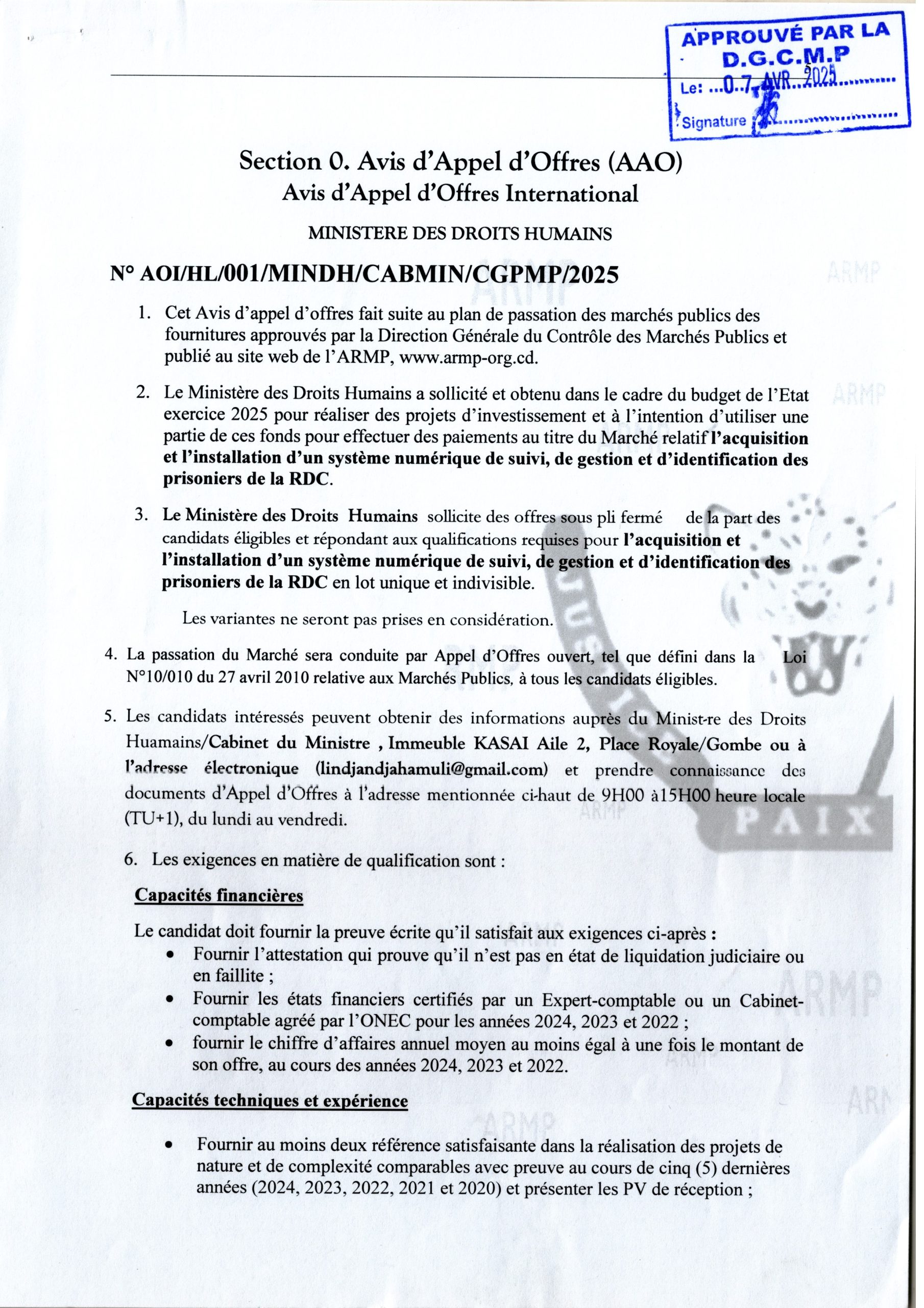 Acquisition et installation d’un système numérique de suivi, de gestion et l’identification des prisonniers de la RDC