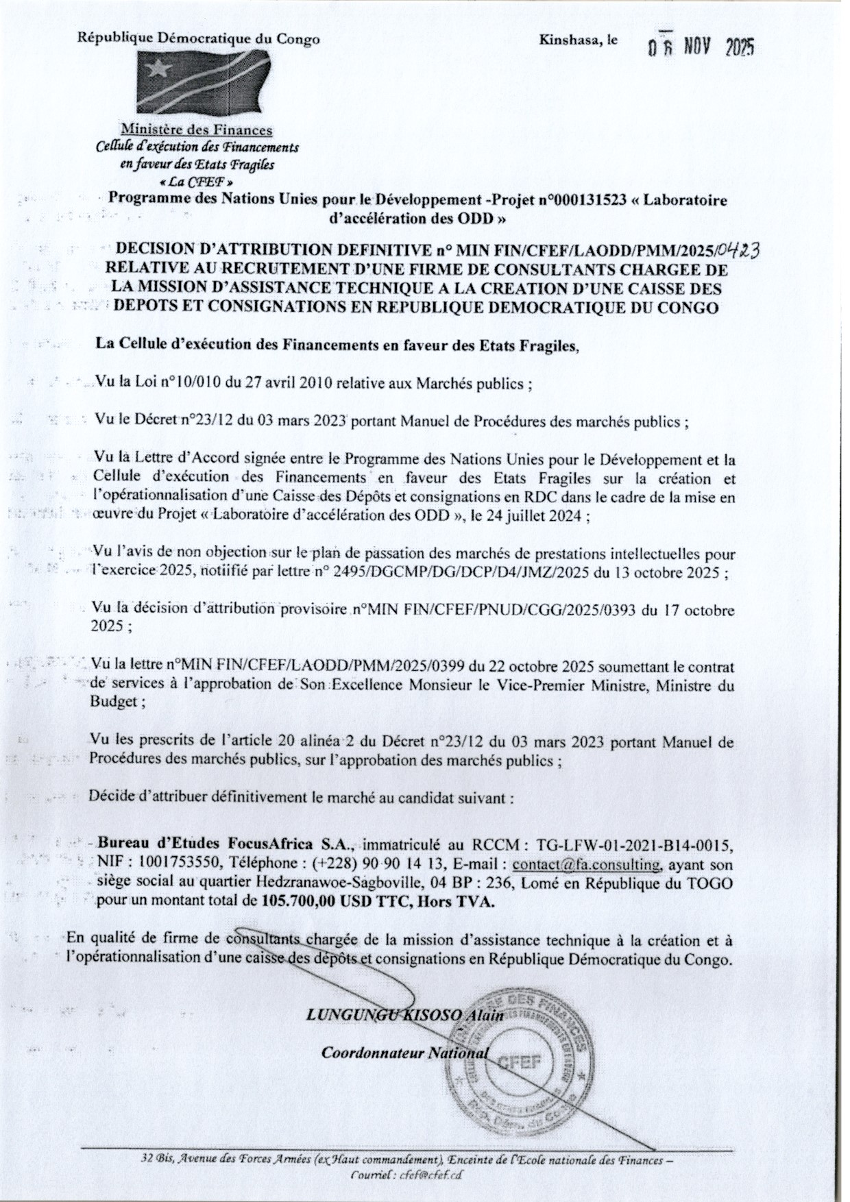 Attribution définitive accordée au Bureau d’Etudes FocusAfrica relative au recrutement d’une firme de consultants chargée de la mission d’assistance technique à la création d’une caisse des dépôts et consignations en République Démocratique du Congo.