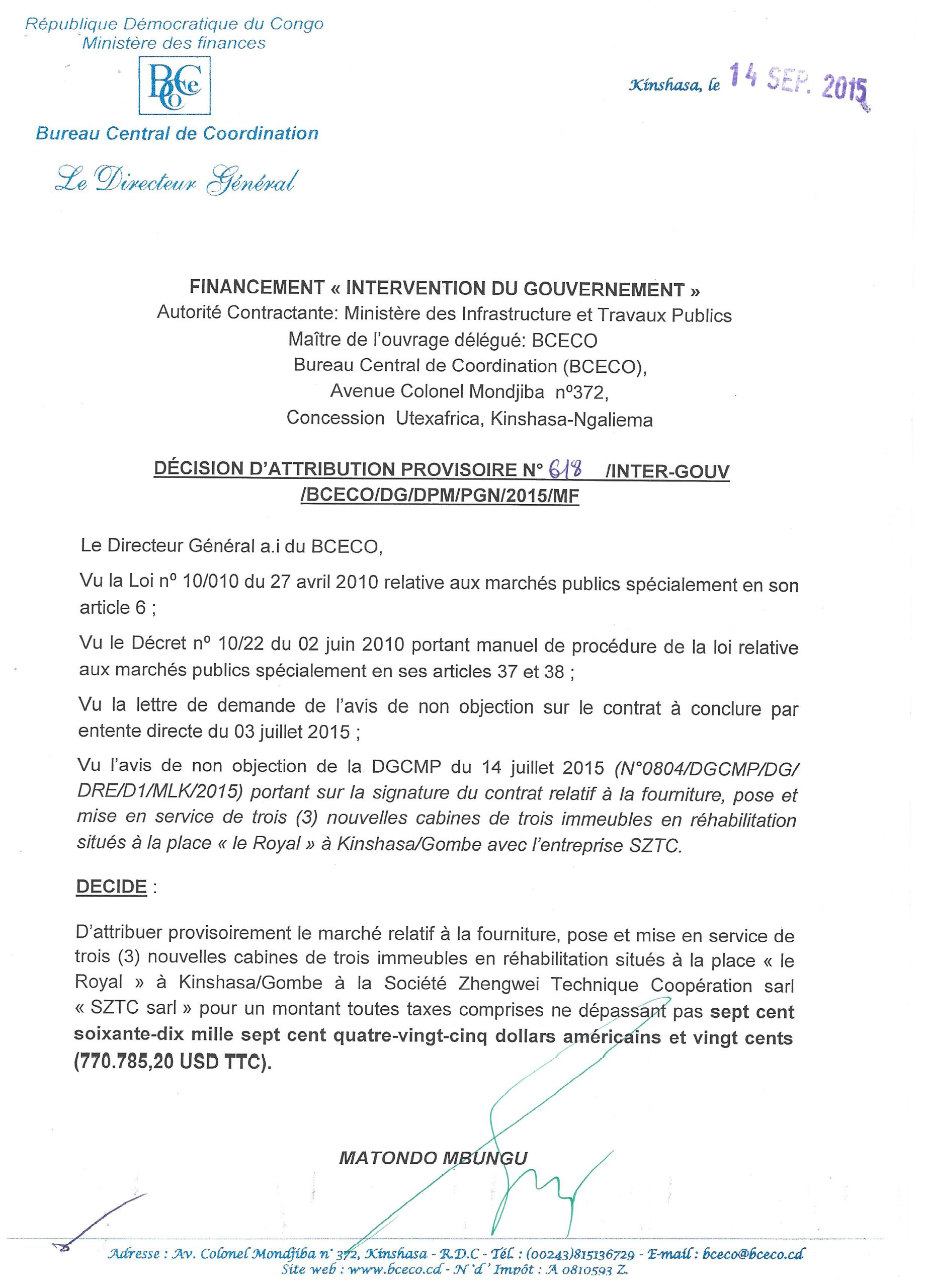 Attribution provisoire accordée à la société ZHENG WEI technique coopération Sarl « SZTC » du marché relatif à la fourniture, pose et mise en service de trois (3) nouvelles cabines de trois immeubles en réhabilitation situés à la place le royal à KINSHASA/GOMBE.