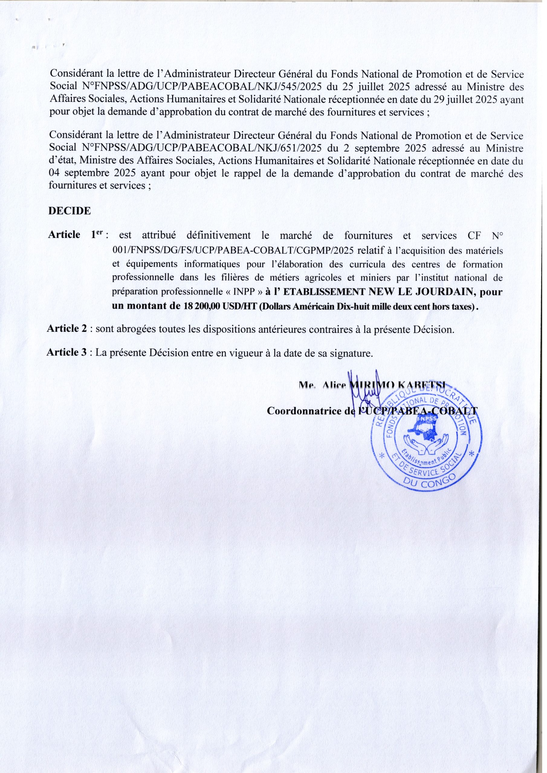 Attribution provisoire accordée à l’ETABLISSEMENT NEW LE JOURDAIN relative à l’acquisition des matériels et équipements informatiques pour l’élaboration des curricula des centres de formation professionnelle dans les filières de métiers agricoles et miniers par l’INPP.